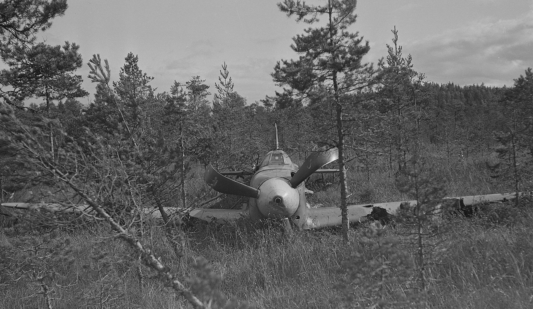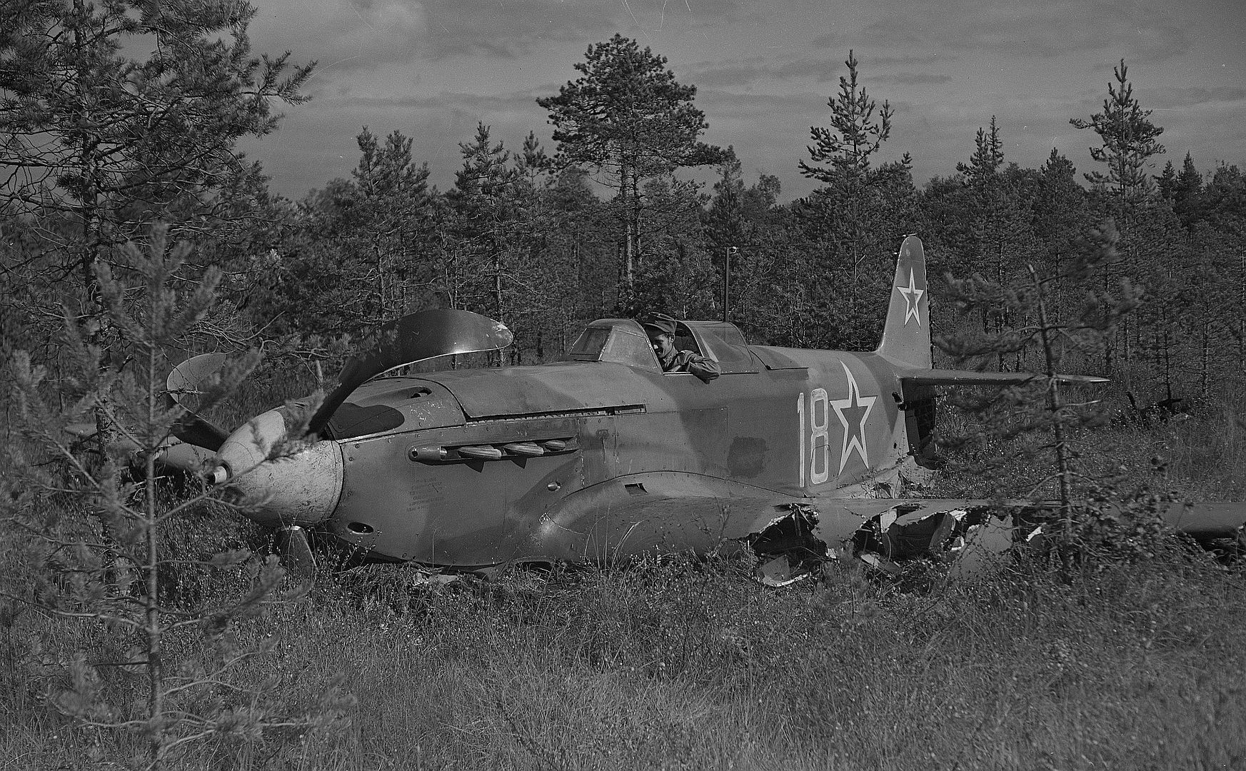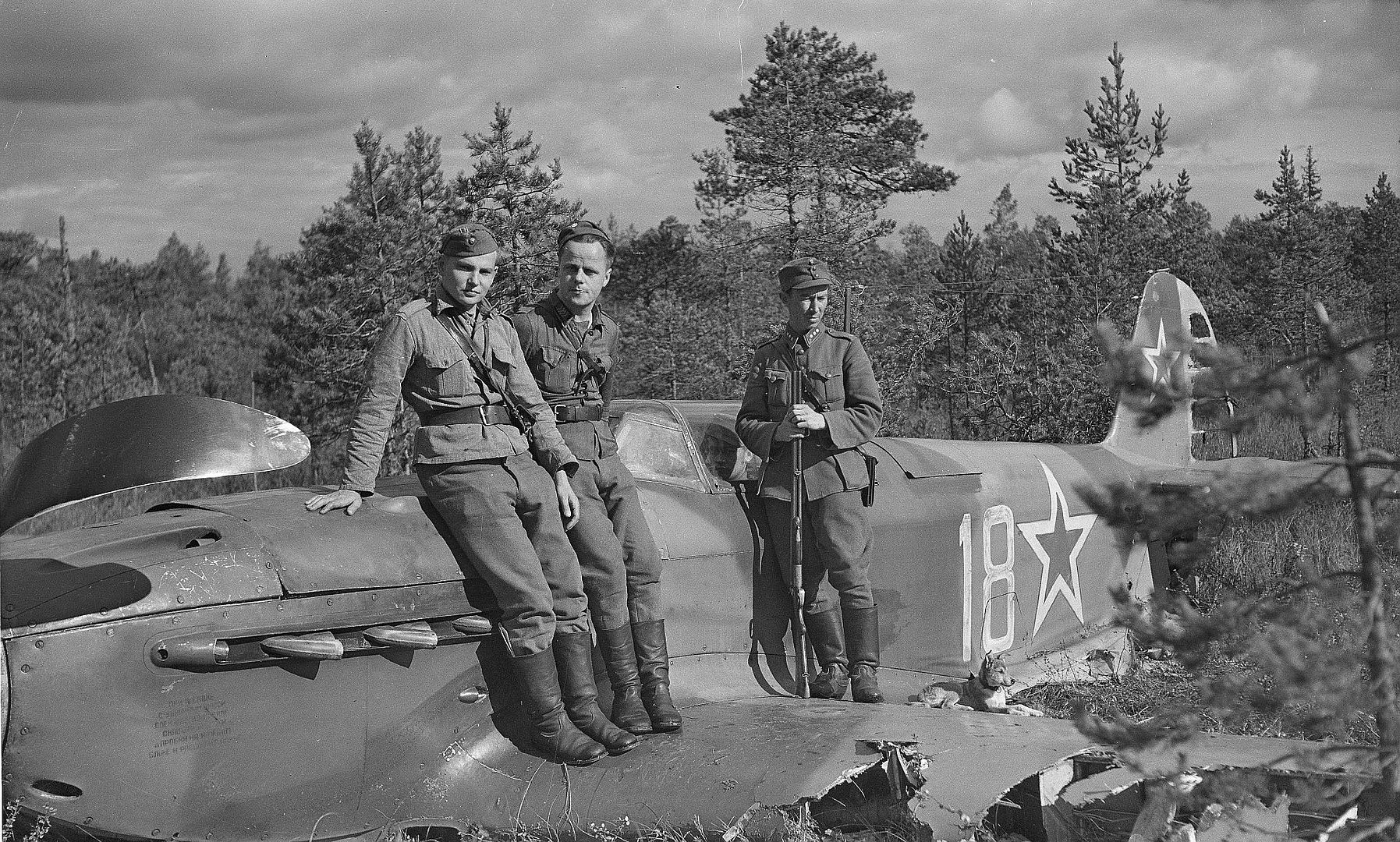 Finnish soldiers pose on the wing of a Soviet Yak-9 fighter plane that made an emergency landing in the Khovinkul area (now the village of Petrovskoye in the Vsevolozhsky District of the Leningrad Region) on August 30, 1944. The captain is holding a hunting rifle. The aircraft belonged to the 29th Guards Fighter Aviation Regiment of the 275th Fighter Aviation Division of the 13th Air Army of the Leningrad Front. It was flown from the Manisiemi airfield to the Commandant's airfield by Guard Lieutenant Mikhail Matveyevich Volkov, with Guard Junior Lieutenant Vladimir Matveyevich Titorenko as a passenger. Both pilots were taken prisoner but were released in September.