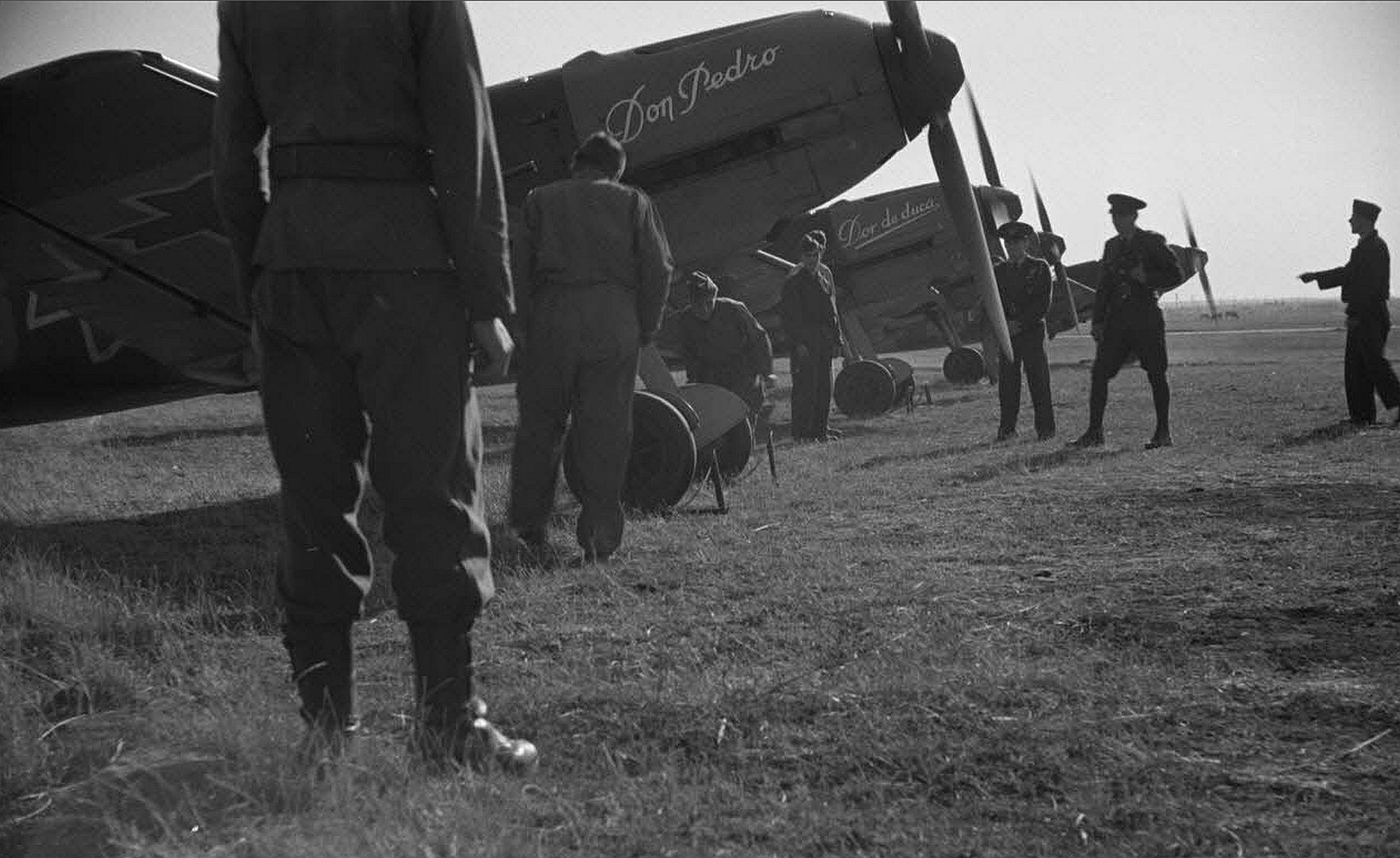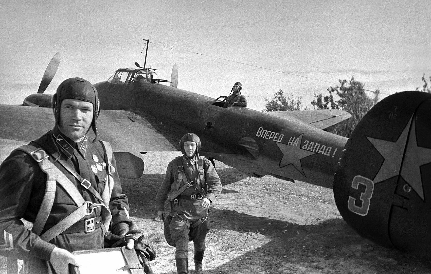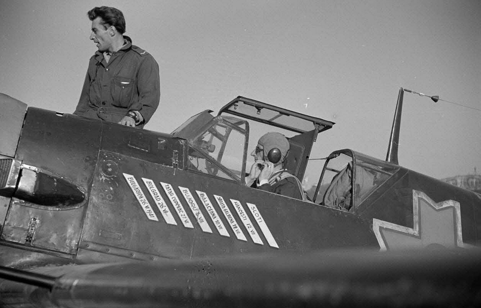 Finnish soldiers pose on the wing of a Soviet Yak-9 fighter plane that made an emergency landing in the Khovinkul area (now the village of Petrovskoye in the Vsevolozhsky District of the Leningrad Region) on August 30, 1944. The captain is holding a hunting rifle. The aircraft belonged to the 29th Guards Fighter Aviation Regiment of the 275th Fighter Aviation Division of the 13th Air Army of the Leningrad Front. It was flown from the Manisiemi airfield to the Commandant's airfield by Guard Lieutenant Mikhail Matveyevich Volkov, with Guard Junior Lieutenant Vladimir Matveyevich Titorenko as a passenger. Both pilots were taken prisoner but were released in September.
