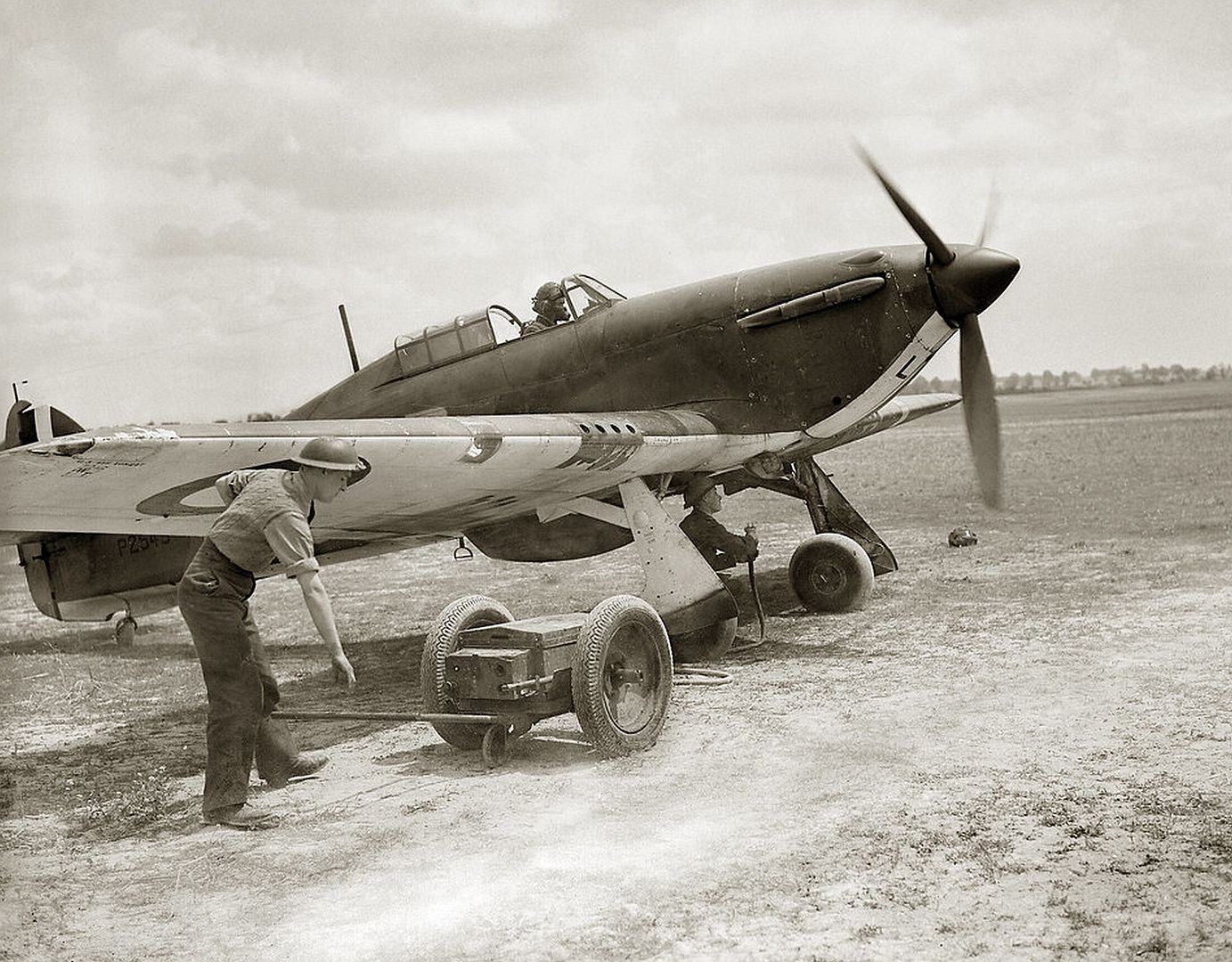 Ground crewmen using a trolley-accumulator start up a Hawker Hurricane Mark I of No. 501 Squadron RAF at Betheniville, in northeastern France.