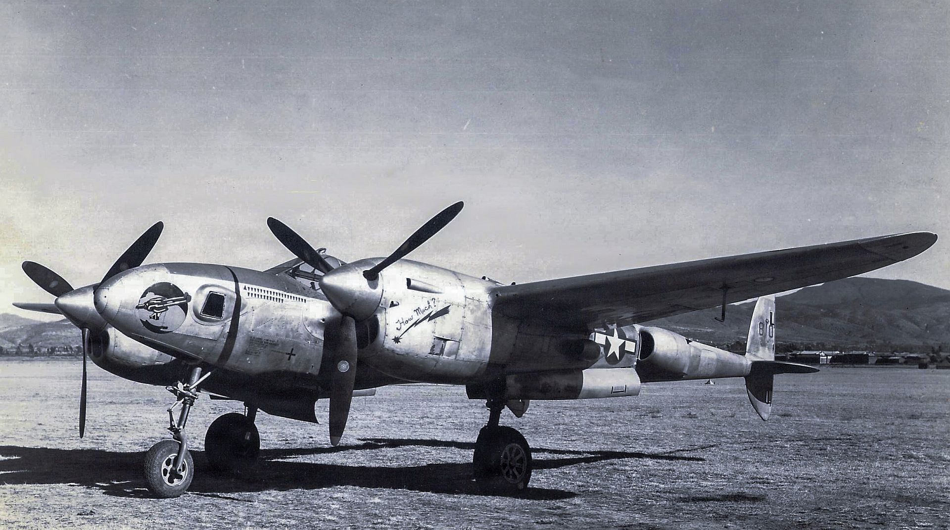 A fine study of a 35th Photographic Reconnaissance Squadron, “G” Flight Lockheed F-5E Photo Lightning at Yunnanyi, China. George Flight deployed to Yunnanyi in mid-September, 1944, and in late October made a short move over to nearby Beiting Airfield, perhaps where this picture was taken. It shows the distinctive original Redhawk emblem on the nose, a mountain symbol for the flight from India over “The Hump” (Himalayan Mountains) into China and 32 photo recon mission symbols (the number of which suggest this photo was possibly taken in 1945 before the flight’s next move in February) and the three-digit aircraft number, 810, assigned to this aircraft. The aircraft was produced as Lockheed P-38J-15-LO Lightning fighter, serial number 43-28610 and then converted at Dallas, Texas into an F-5E-2-LO photographic reconnaissance version of the famous fighter plane before being shipped to India, reassembled and flown over the Hump to China in September, 1944. It flew through the squadron’s time in China, with a last known photo recon mission recorded on July 28, 1945. (142nd Wing History Archive)