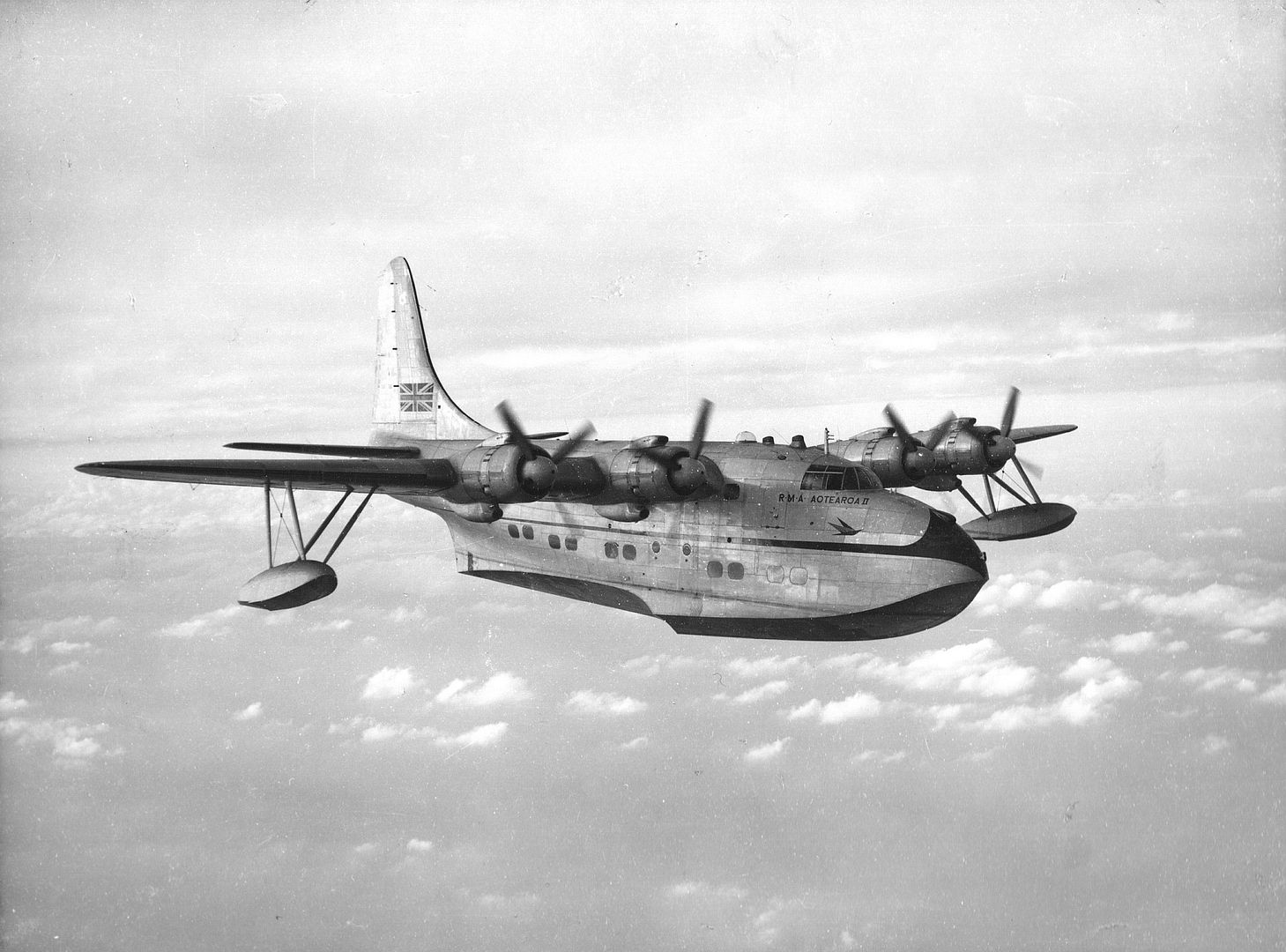 Short Solent Mk IV seaplane built for Tasman Empire Airways Limited (TEAL). Launched in Belfast and christened "Aotearoa II" by Princess Elizabeth in 1949. Transported Queen Elizabeth II and Prince Philip to Fiji during the 1953-1954 Royal Tour. Withdrawn from New Zealand Registry in 1955 and sold to Aquila Airways, London. The aircraft was later bought by ARTOP, Portugal, and abandoned on a beach by the River Targus, Lisbon, and eventually broken up for scrap in 1971. -