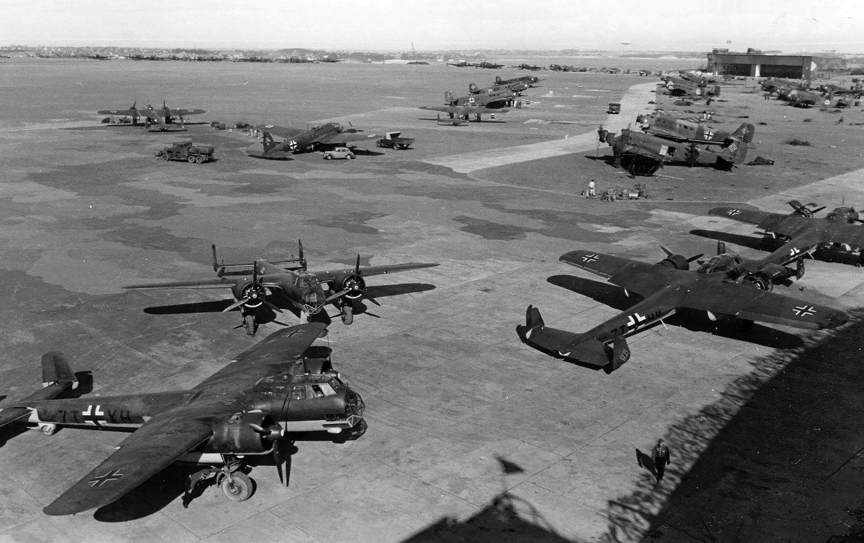 Dornier Do.17Z reconnaissance aircraft of the 606th Coastal Aviation Group (KuFlGr606),in the background Heinkel He-111 bomber, and Junkers Ju-52 transport aircraft,taken at Kiel-Holtenau airfield.