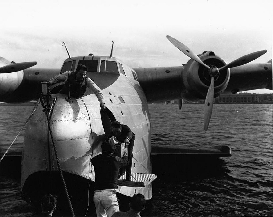 As they neared the harbor, Ford could see that it was filled with warships, so he set the Clipper down in the smooth water just outside the harbour entrance. "We turned around to head back," Ford said. "There was a launch that had come out to meet us, but instead of giving us a tow or a line, they stayed off about a mile and kept waving us on. Finally when we got further into the harbour they came closer. It turned out that we had landed right in the middle of a minefield, and they weren't about to come near us until they saw that we were through it!"