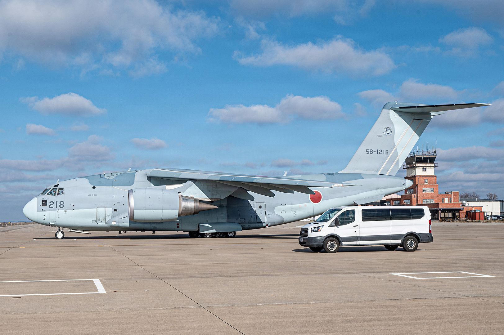A Kawasaki C-2 cargo aircraft assigned to the 2nd Tactical Airlift Group, Japan Air Self-Defense Force, prepares for takeoff at Rosecrans Air National Guard Base, St. Joseph, Missouri, Dec. 10, 2025. Airmen from the JASDF attended the Advanced Tactics Aircrew Course of the Advanced Airlift Tactics Training Center. (U.S. Air National Guard photo by Michael Crane)