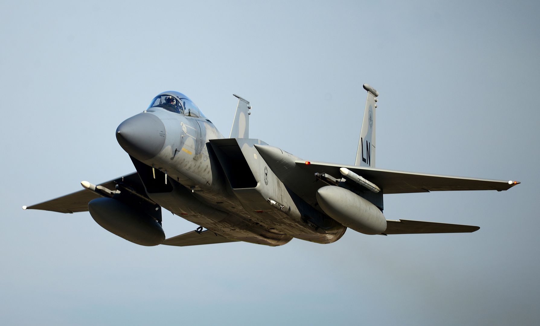 An F-15C Eagle assigned to the 493rd Fighter Squadron returns from a joint training sortie with F/A-18 Super Hornets and F-22 Raptors at Royal Air Force Lakenheath, England, Oct. 16, 2018. The training serves as a demonstration of U.S. commitment to European regional security. (U.S. Air Force photo/ Tech. Sgt. Matthew Plew)