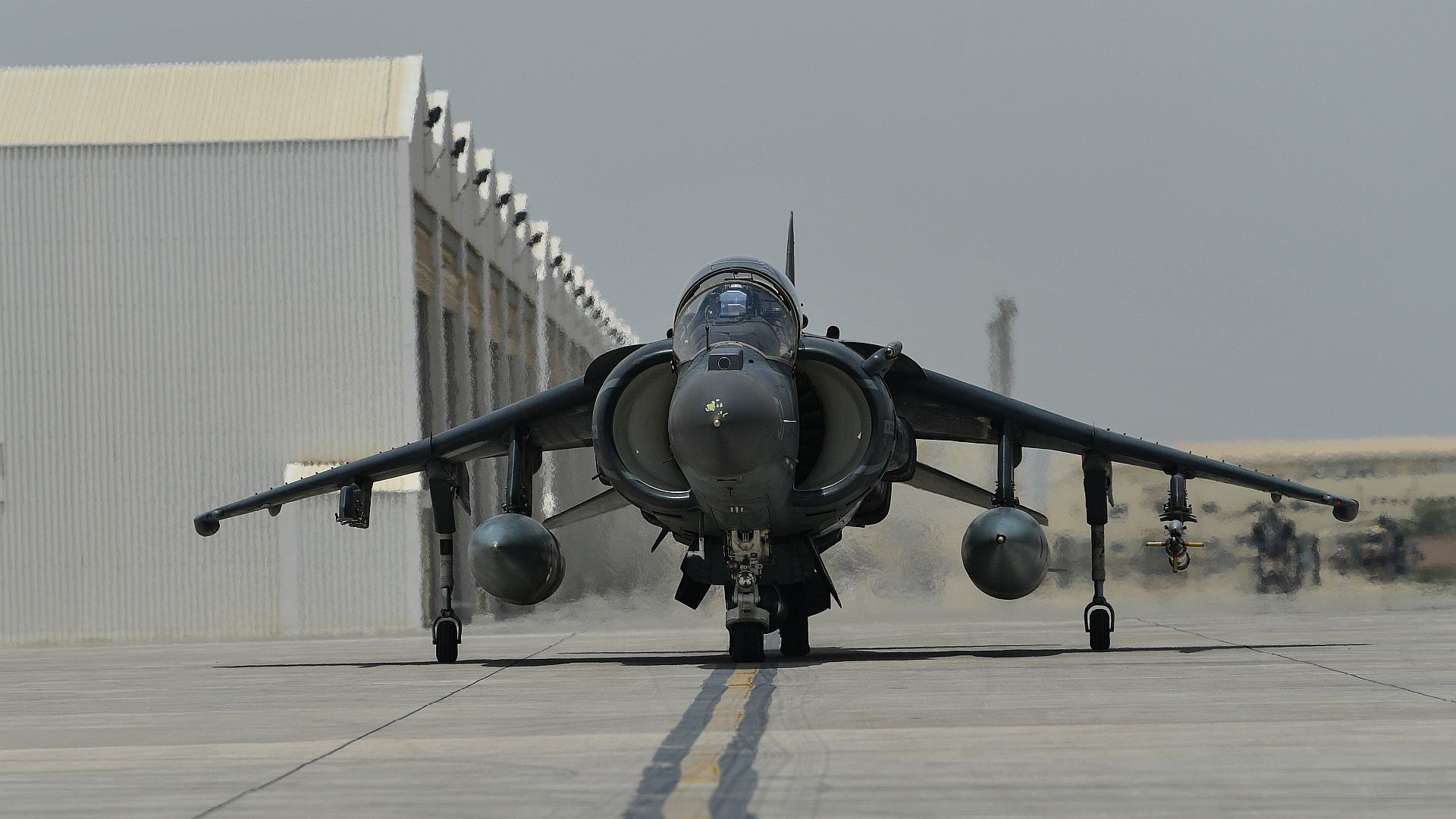 A U.S. Marine Corps AV-8B Harrier II taxies down the flightline during Desert Flag 19-2 at Al Dhafra Air Base, United Arab Emirates, April 28, 2019. Desert Flag is designed to exercise combined Air Forces in military operations to enhance competence and strengthen military-to-military relationships and regional security. (U.S. Air Force photo by Staff Sgt. Chris Drzazgowski)