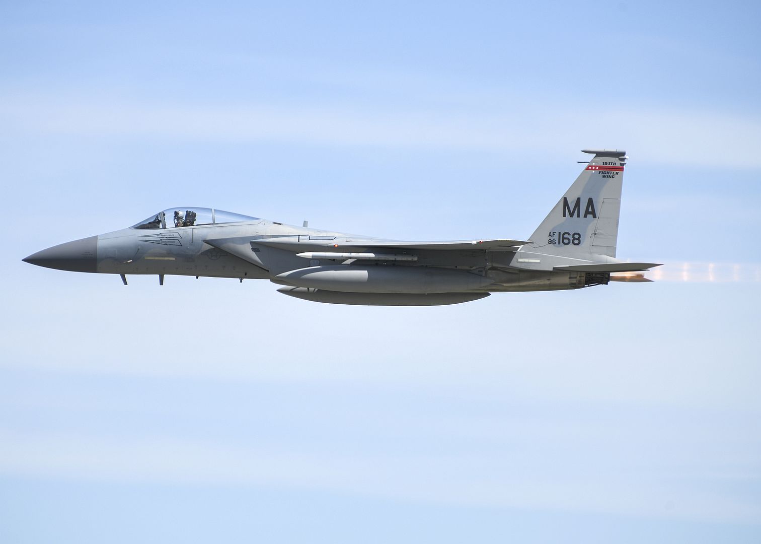 An F-15 Eagle takes off during a base tour April 19, 2019, at Barnes National Guard Base, Massachusetts. Scouts from Pack 338 and Troop 338 visted the 104th Fighter Wing and gained a better understanding of what the Air National Guard does on a daily basis. (U.S. Air National Guard photo by Airman 1st Class Randy Burlingame)