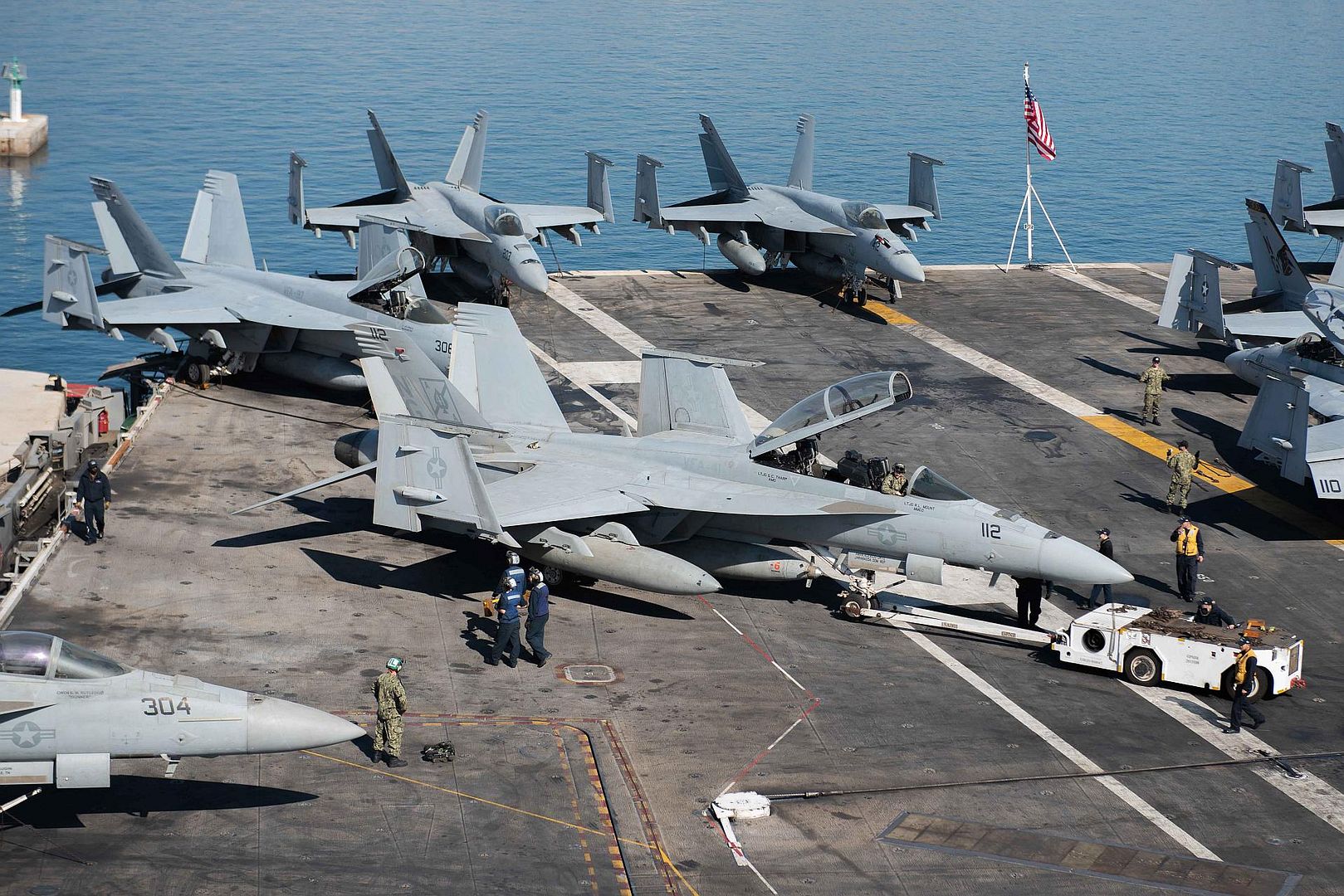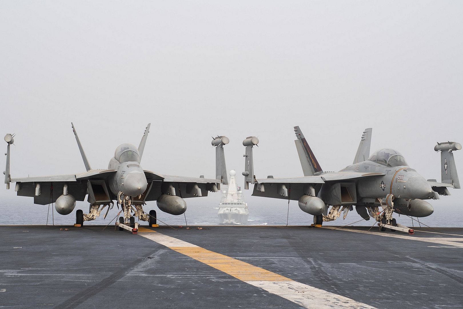 MEDITERRANEAN SEA (April 25, 2019) Two F/A-18E Super Hornets from the "Pukin' Dogs" of Strike Fighter Squadron (VFA) 143 launch from the flight deck of the Nimitz-class aircraft carrier USS Abraham Lincoln (CVN 72) to conduct a long-range strike exercise together with the John C. Stennis Carrier Strike Group, U.S. Air Force 603rd Air Control Squadron and the Romanian Air Force. Abraham Lincoln is deployed as part of the Abraham Lincoln Carrier Strike Group (ABECSG) in support of maritime security cooperation efforts in the U.S. 5th, U.S. 6th and U.S. 7th Fleet areas of operation. With Abraham Lincoln as the flagship, deployed strike group assets include staffs, ships and aircraft of Carrier Strike Group 12 (CSG 12), Destroyer Squadron 2 (DESRON 2), USS Leyte Gulf (CG 55) and Carrier Air Wing 7 (CVW 7); as well as ?lvaro de Baz?n-class frigate ESPS M?ndez N??ez (F 104). (U.S. Navy photo by Mass Communication Specialist 3rd Class Amber Smalley/Released)