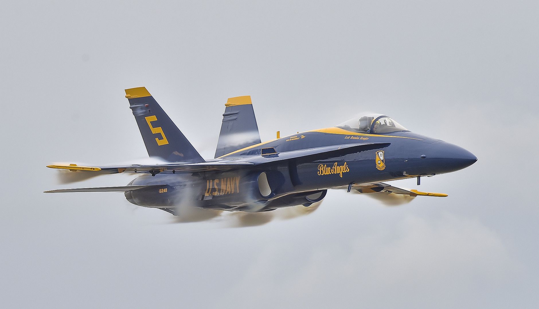 PENSACOLA, Fla. (April 24, 2019) Lead Solo Pilot Lt. Cmdr. Brandon Hempler, assigned to the U.S. Navy Flight Demonstration Squadron, the Blue Angels, performs the ?sneak pass? maneuver during a practice demonstration at Naval Air Station (NAS) Pensacola. The team is scheduled to conduct 61 flight demonstrations at 32 locations across the country to showcase the pride and professionalism of the U.S. Navy and Marine Corps to the American public in 2019. (U.S. Navy photo by Mass Communication Specialist 2nd Class Timothy Schumaker/Released)