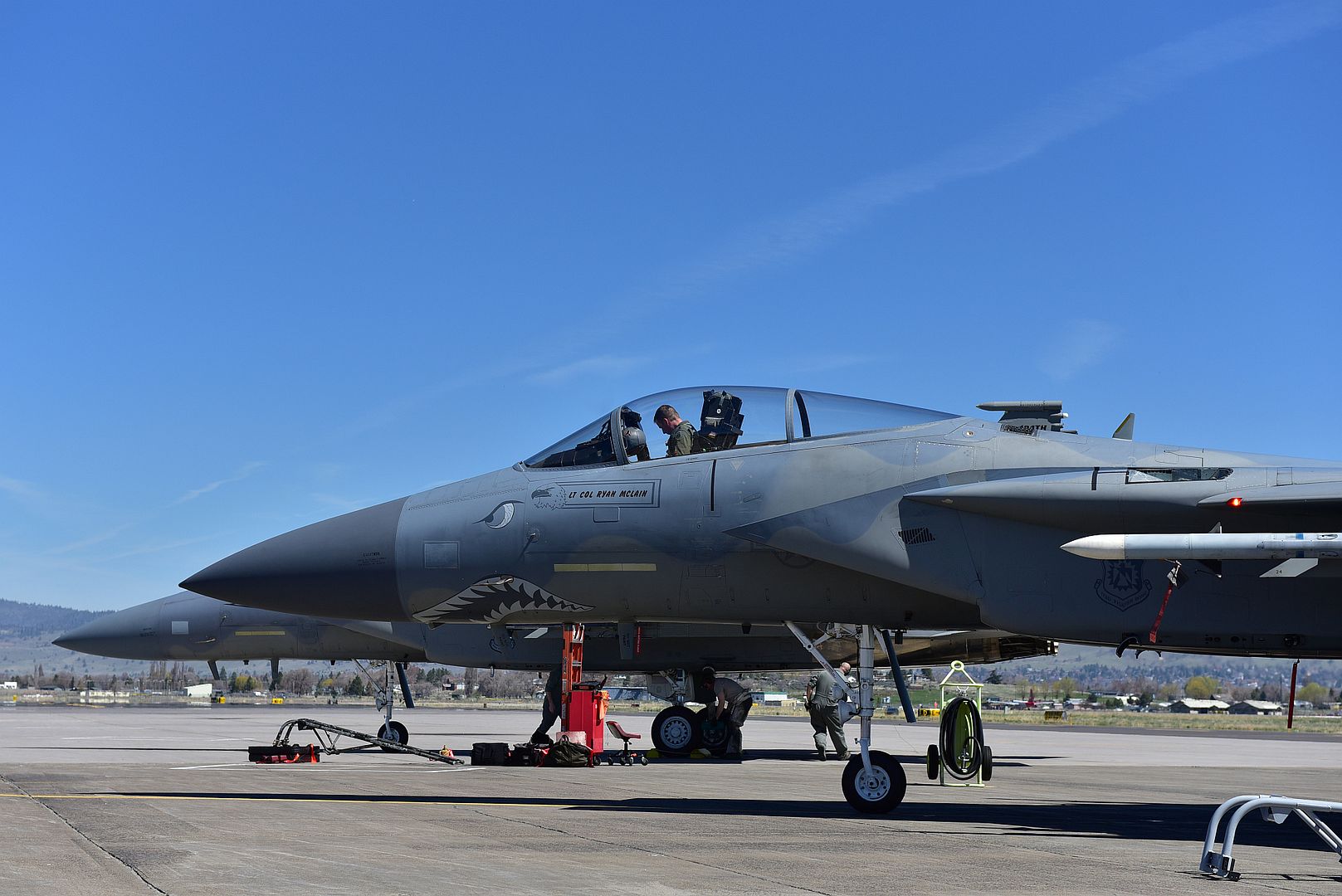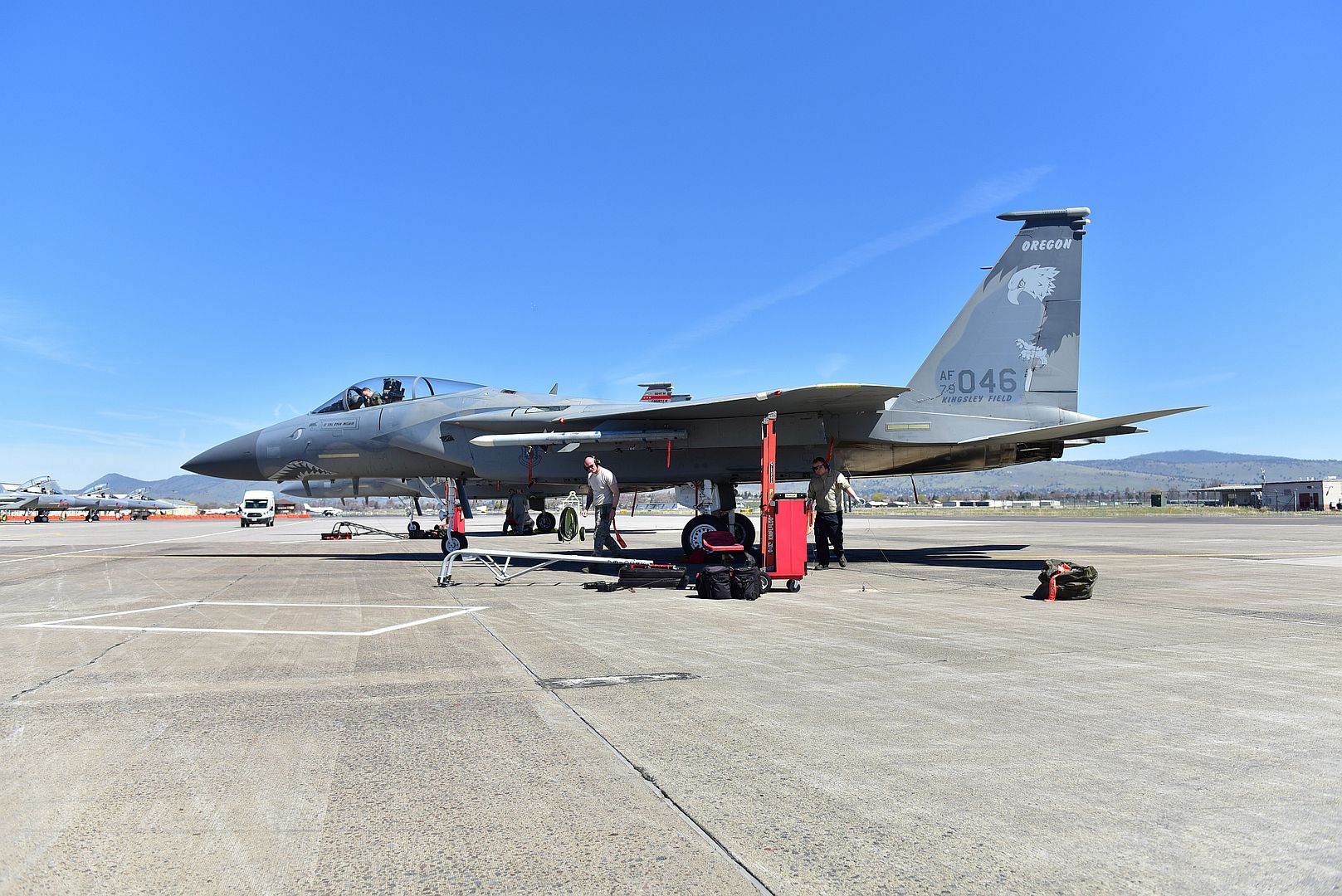Main AdminA U.S. Air Force F-15C Eagle from the 173rd Fighter Wing, Oregon Air National Guard, taxis to a parking spot on the ramp following a training mission at Kingsley Field in Klamath Falls, Oregon April 25, 2019. The 173rd FW is home to the sole F-15C training base for the United States Air Force. (U.S. Air National Guard photo's by Senior Master Sgt. Jennifer Shirar)