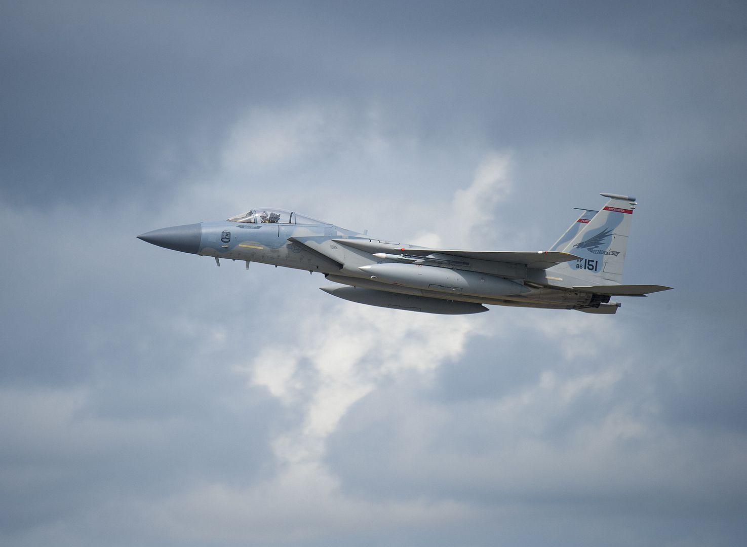 An F-15 Eagle from the Portland Air National Guard?s 142nd Fighter Wing flies over Tyndall Air Force Base, Fla., April 9, 2019. Operations specialists, aircraft maintainers, weapons loaders, and pilots from the 142nd Fighter Wing, Ore. participated in a two-week long Weapons System Evaluation Program (WSEP) purposed to assess pilots and equipment in air-to-air combat scenarios. (U.S. Air National Guard photo by Tech. Sgt. Steph Sawyer, 142nd Fighter Wing Public Affairs)