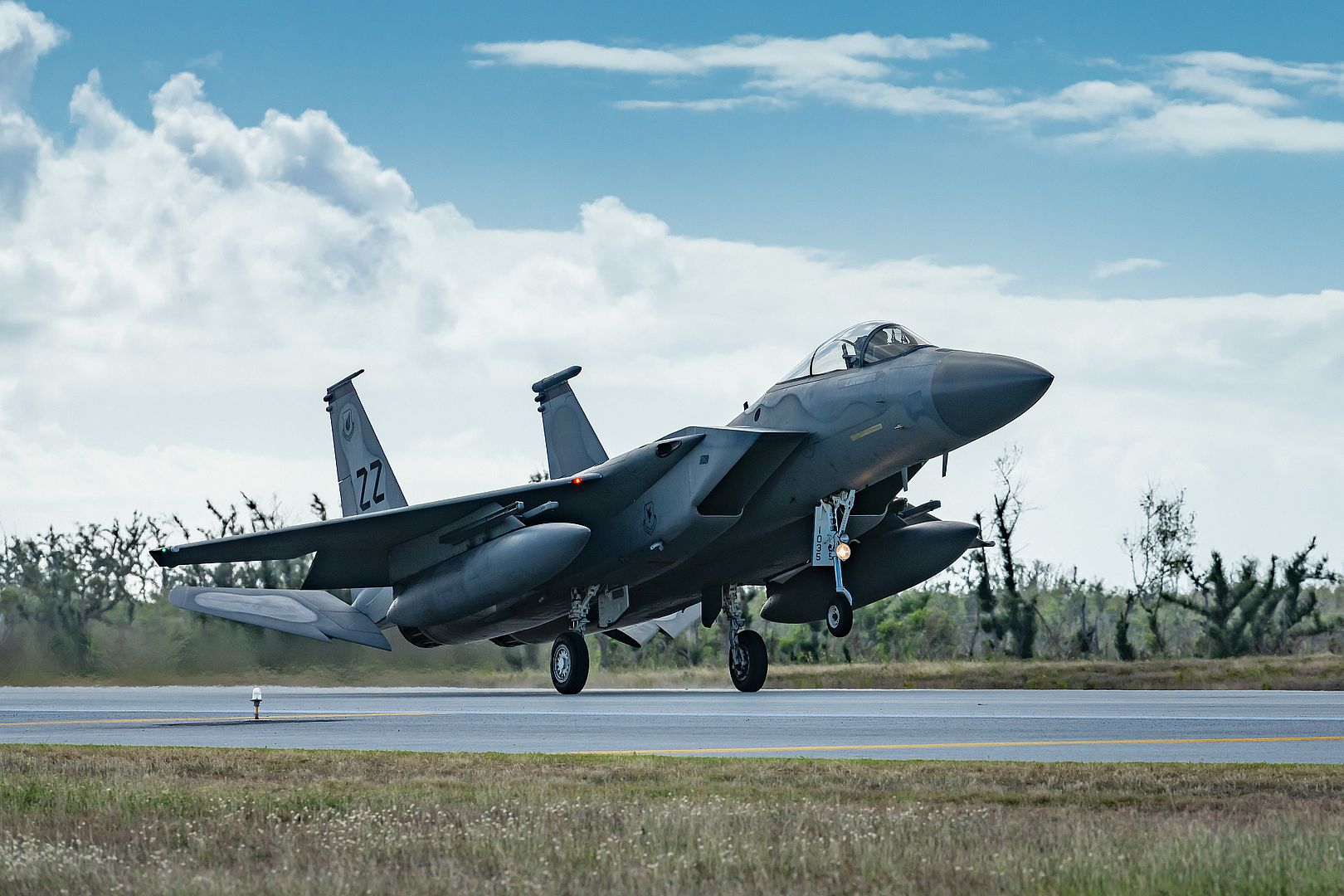 An F-15C Eagle from the 44th Fighter Squadron, Kadena Air Base, Japan, lands at Tinian International Airport, Tinian, during exercise Resilient Typhoon, April 23, 2019. Resilient Typhoon is a dispersal exercise based at Andersen Air Force Base, Guam, designed to validate Pacific Air Force?s ability to maintain readiness while adapting to rapidly evolving regional events such as inclement weather. (U.S. Air Force photo by Airman 1st Class Matthew Seefeldt)