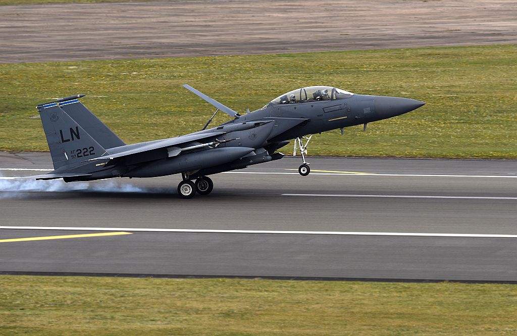 An F-15E Strike Eagle assigned to the 494th Fighter Squadron lands on the flight line at Royal Air Force Lakenheath, England, April 23, 2019. The 48th Fighter Wing is participating in a readiness exercise from 23-25 April focused on continuous operations over a 48-hour period. (U.S. Air Force photo by Airman 1st Class Madeline Herzog)