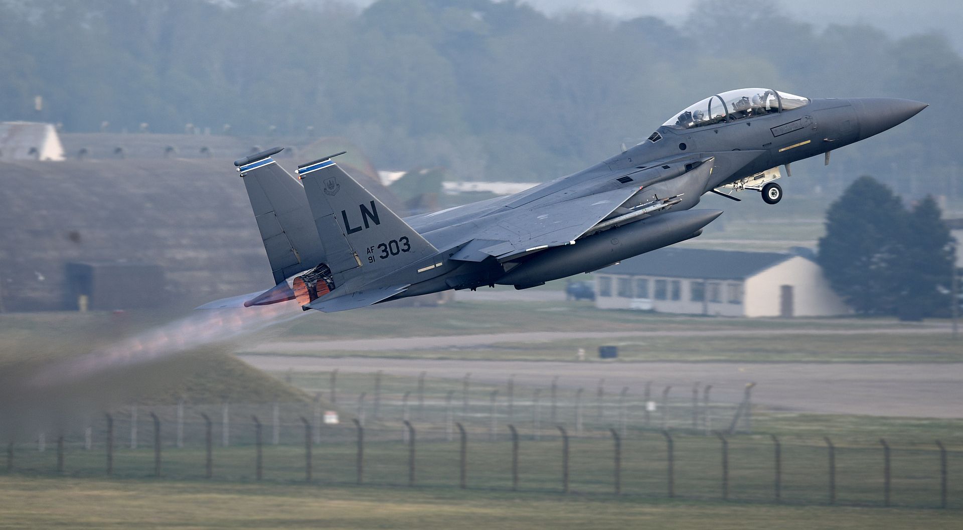 An F-15E Strike Eagle assigned to the 492nd Fighter Squadron takes off from the flight line at Royal Air Force Lakenheath, England, April 24, 2019. The 48th Fighter Wing is participating in a readiness exercise from 23-25 April focused on continuous operations over a 48-hour period. (U.S. Air Force photo by Airman 1st Class Madeline Herzog)