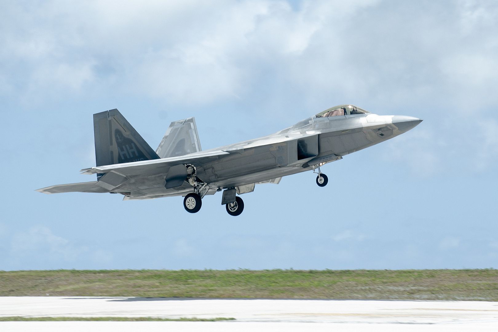 An F-22 Raptor, from Joint Base Pearl Harbor-Hickam, Hawaii, lands at Andersen Air Force Base, Guam, during exercise Resilient Typhoon, April 22, 2019. The exercise is designed to validate Pacific Air Forces ability to maintain readiness while adapting to rapidly evolving events such as inclement weather. The ?Hawaiian Raptors? are comprised of Airmen from Hawaii Air National Guard?s 154th Wing and their active-duty counterparts from the 15th Wing. (Air National Guard photo by Senior Airman John Linzmeier)