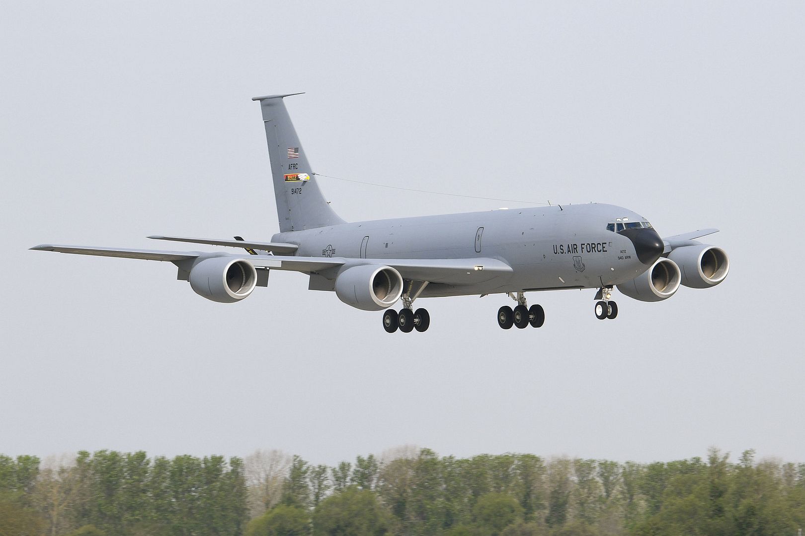 A U.S. Air Force KC-135 Stratotanker assigned to the 100th Air Refueling Wing on approach at RAF Mildenhall, England, in support of Mission Assurance exercise 19-1, April 24, 2019. The exercise was designed to emphasize the importance of combat skills effectiveness training and test 100th ARW and 48th Fighter Wing Airmen on their ability to survive and operate in wartime conditions (U.S. Air Force photo by Senior Airman Alexandria Lee)