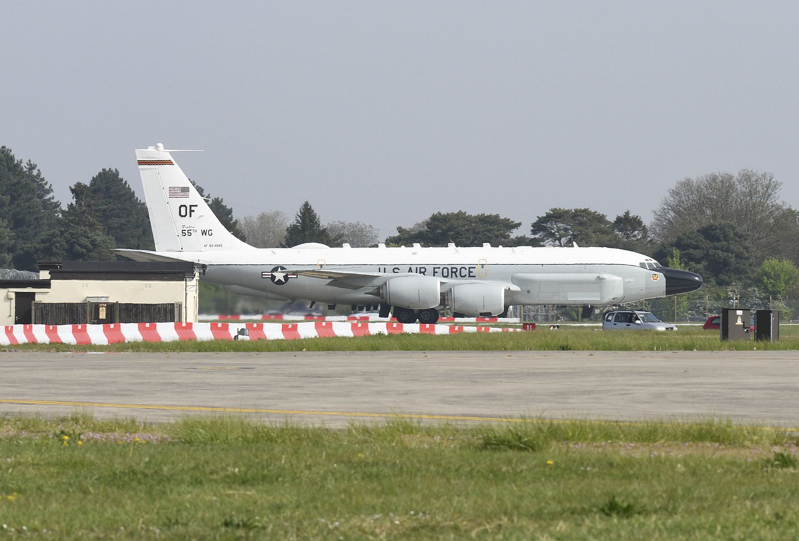 A U.S. Air Force RC-135 Rivet Joint, assigned to the 95th Reconnaissance Squadron, takes off the flightline at RAF Mildenhall, ,April 24, 2019. The RC-135 is a reconnaissance aircraft, hosting a myriad of technology behind the cockpit. (U.S. Air Force photo by Senior Airman Alexandria Lee)