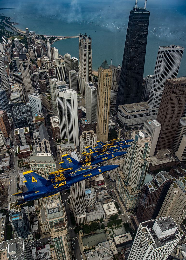 CHICAGO (August 16, 2019) The U.S. Navy Flight Demonstration Squadron, the Blue Angels, diamond pilots perform the echelon parade during the 2019 Chicago Air and Water Show. The Blue Angels are scheduled to conduct 61 flight demonstrations at 32 locations across the country to showcase the pride and professionalism of the U.S. Navy and Marine Corps to the American public in 2019. (U.S. Navy photo by Mass Communication Specialist 1st Class Ian Cotter/Released)
