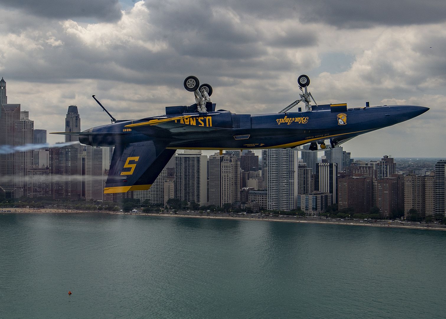 CHICAGO (August 16, 2019) The U.S. Navy Flight Demonstration Squadron, the Blue Angels, lead solo pilot, Lt. Cmdr. Brandon Hempler performs the fortus during the 2019 Chicago Air and Water Show. The Blue Angels are scheduled to conduct 61 flight demonstrations at 32 locations across the country to showcase the pride and professionalism of the U.S. Navy and Marine Corps to the American public in 2019. (U.S. Navy photo by Mass Communication Specialist 1st Class Ian Cotter/Released)