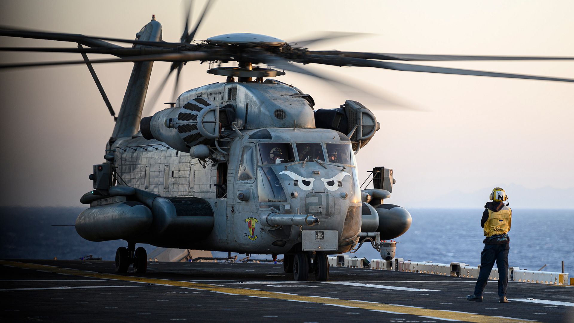 GULF OF AQABA (Aug. 21, 2019) Aviation Boatswain's Mate (Handling) Airman Devante Jones, assigned to amphibious assault ship USS Boxer (LHD 4), signals the crew of a CH-53E Super Stallion, attached to Marine Medium Tiltrotor Squadron (VMM) 163 (Reinforced) during flight operations. Boxer is part of the Boxer Amphibious Ready Group and 11th Marine Expeditionary Unit and is deployed to the U.S. 5th Fleet area of operations in support of naval operations to ensure maritime stability and security in the Central Region, connecting the Mediterranean and the Pacific through the western Indian Ocean and three strategic choke points. (U.S. Navy photo by Mass Communication Specialist 3rd Class Alexander C. Kubitza/Released)