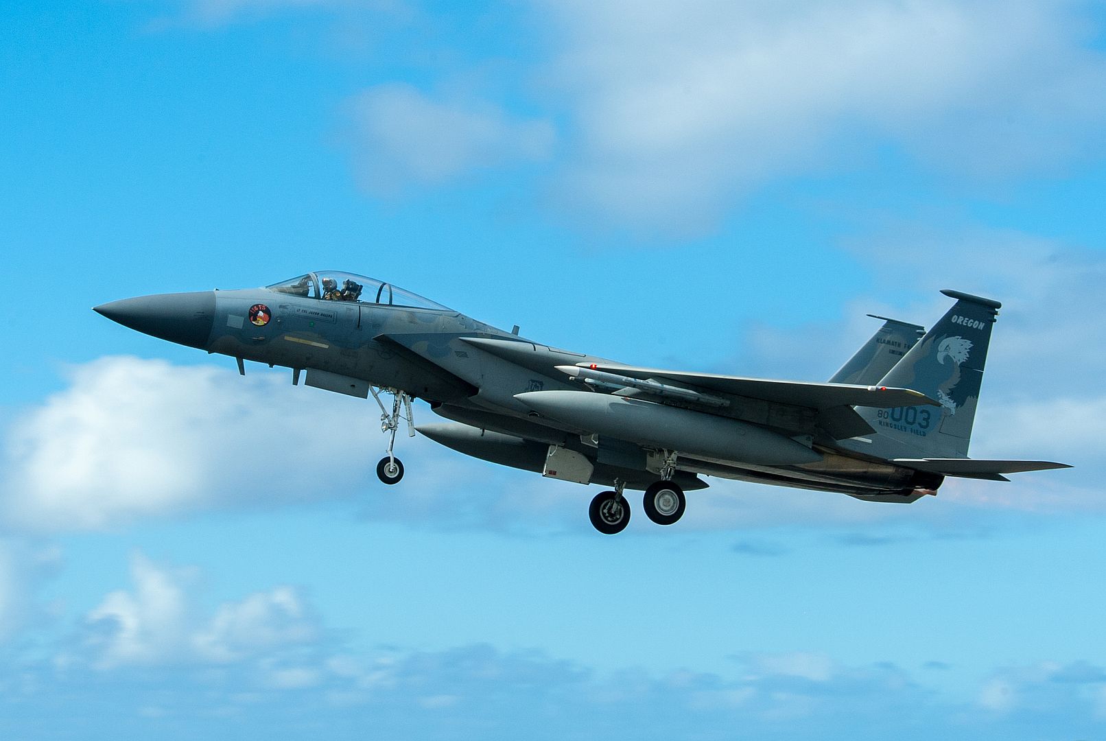 An F-15C Eagle from the 173th Fighter Wing takes off at Joint Base Pearl Harbor-Hickam, Hawaii, Aug. 21, 2019 during fighter exercise Sentry Aloha 19-2. The exercise entails back-to-back combat sorties with visiting aircraft from visiting air national guard units and the Royal Australian Air Force. Sentry Aloha provides participants a multi-faceted, joint venue with supporting infrastructure and personnel. (U.S. Air National Guard photo by Master Sgt. Mysti Bicoy)