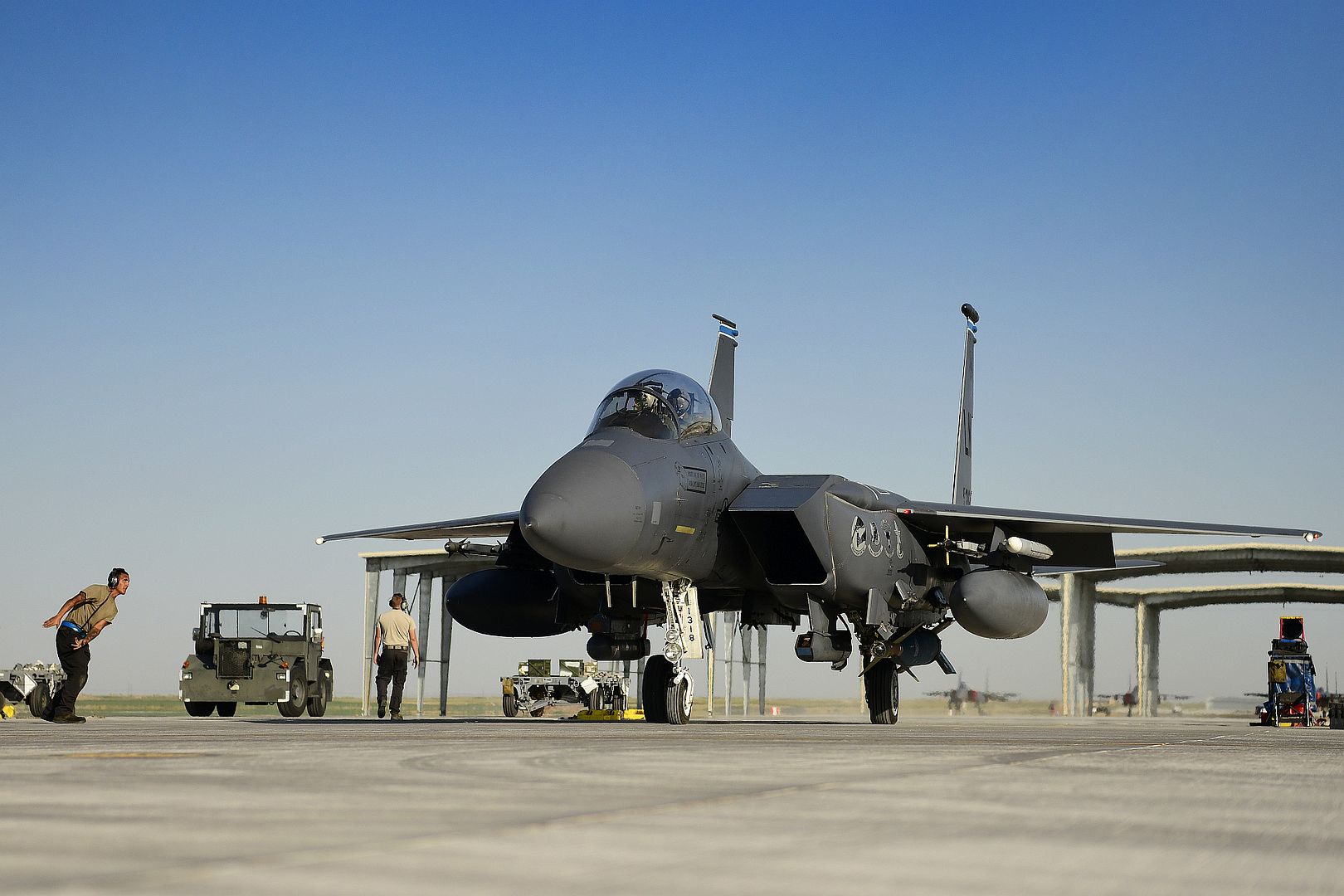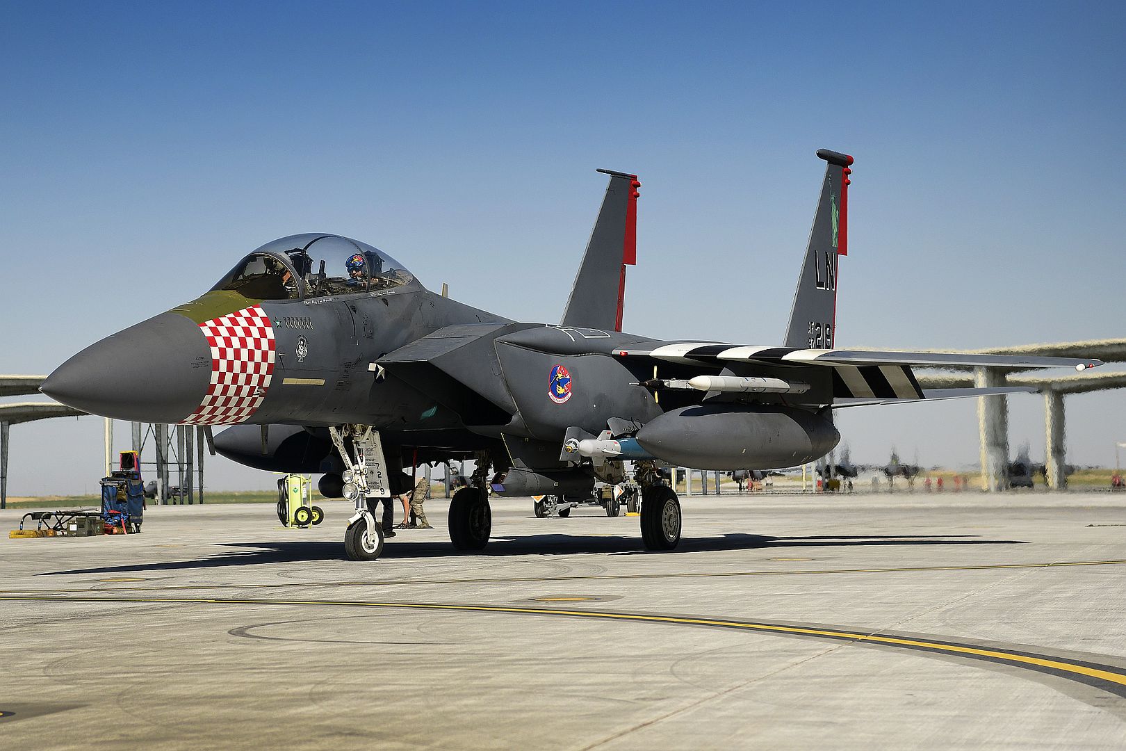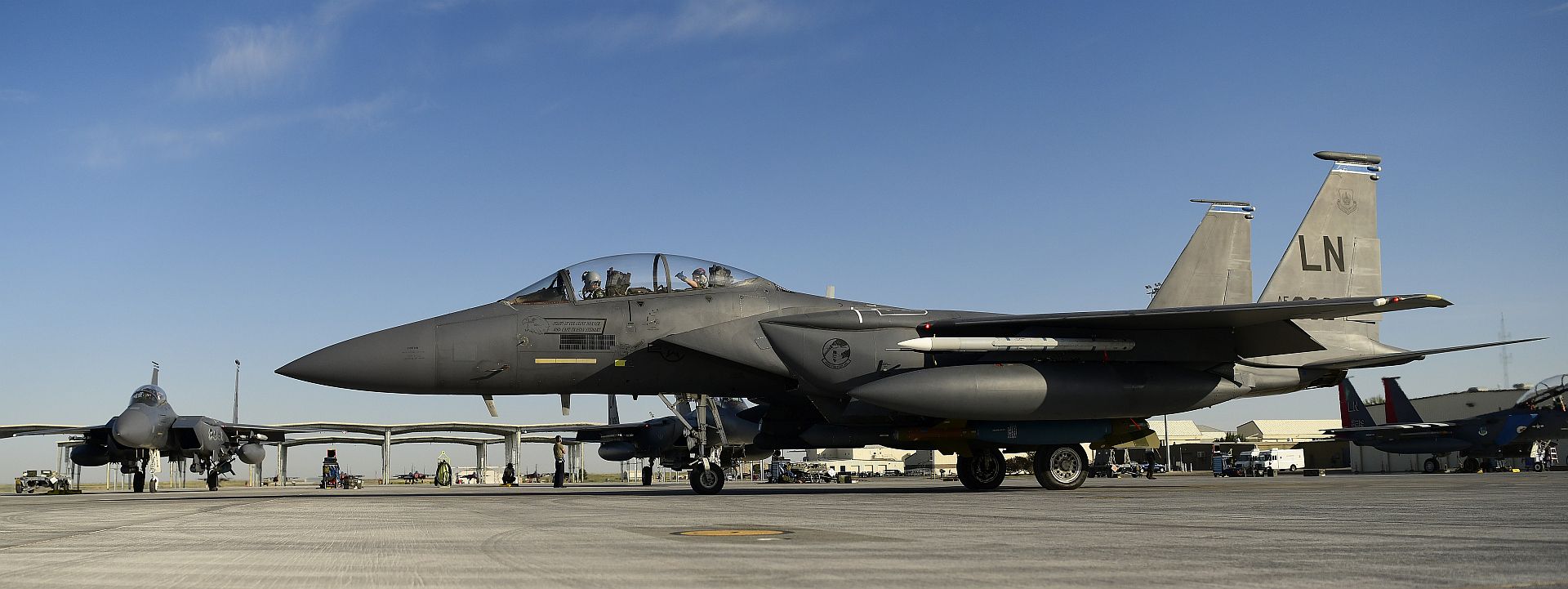 An F-15E Strike Eagle assigned to the 494th Fighter Squadron takes off at Royal Air Force Lakenheath, England, Aug. 21, 2019. The Strike Eagle has the capability to fight its way to a target over long ranges, destroy enemy ground positions and fight its way out. (U.S. Air Force photo by Airman 1st Class Madeline Herzog)