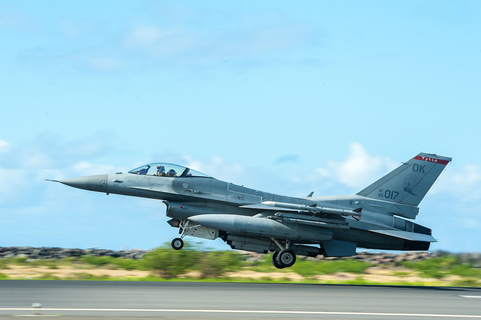 A F-16 Fighting Falcon from the 138th Fighter Wing takes off at Joint Base Pearl Harbor-Hickam, Hawaii, Aug. 21, 2019 during fighter exercise Sentry Aloha 19-2. The longstanding exercise is held on a routine basis to provide Airmen with current, realistic and cost-effective training. This iteration of Sentry Aloha includes Air National Guard members from 15 states and a unit from the Royal Australian Air Force. (U.S. Air National Guard photo by Master Sgt. Mysti Bicoy)