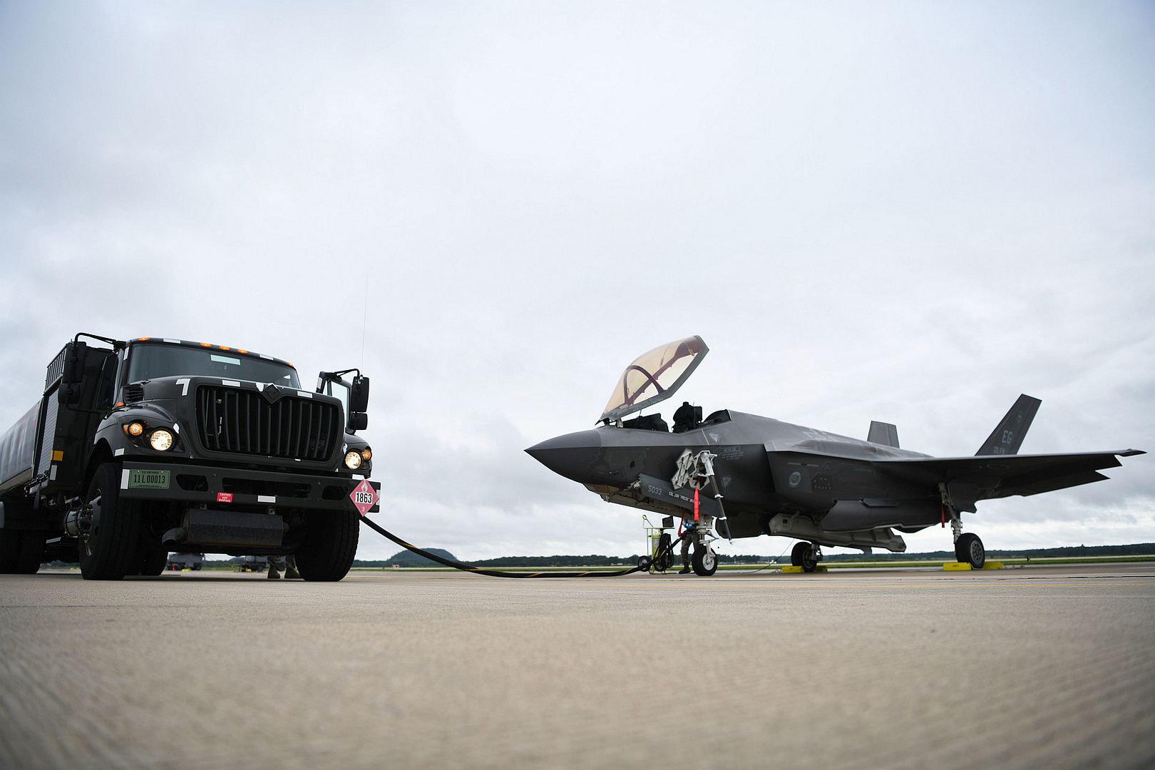 U.S. Air Force Airmen assigned to the 33rd Fighter Wing fuel up an F-35A Lightning II, during the Northern Lightning exercise at Volk Field, Wisconsin, Aug. 14, 2019. Northern Lightning brings together 20 different units for joint total force training of the next generation of air superiority. (U.S. Air Force photo by Airman 1st Class Heather Leveille)