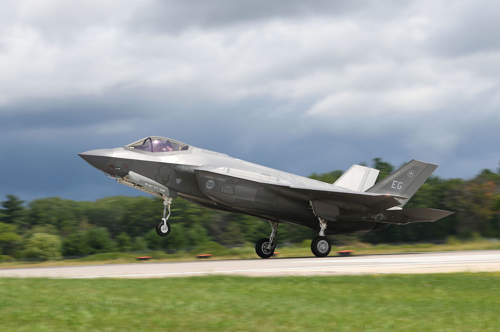 A 33rd Fighter Wing F-35A Lightning II lands, during the Northern Lightning exercise at Volk Field, Wisconsin, Aug. 13, 2019. The Northern Lightning exercise brings together the joint total force of the next generation of air superiority. (U.S. Air Force photo by Airman 1st Class Heather Leveille)