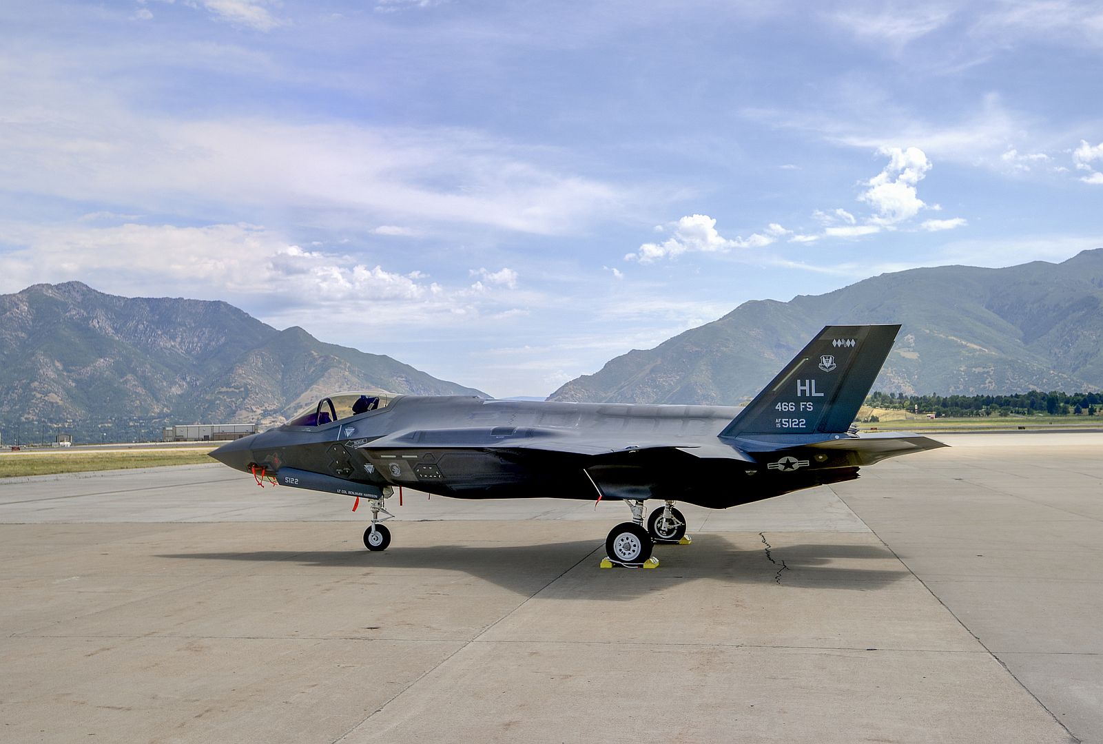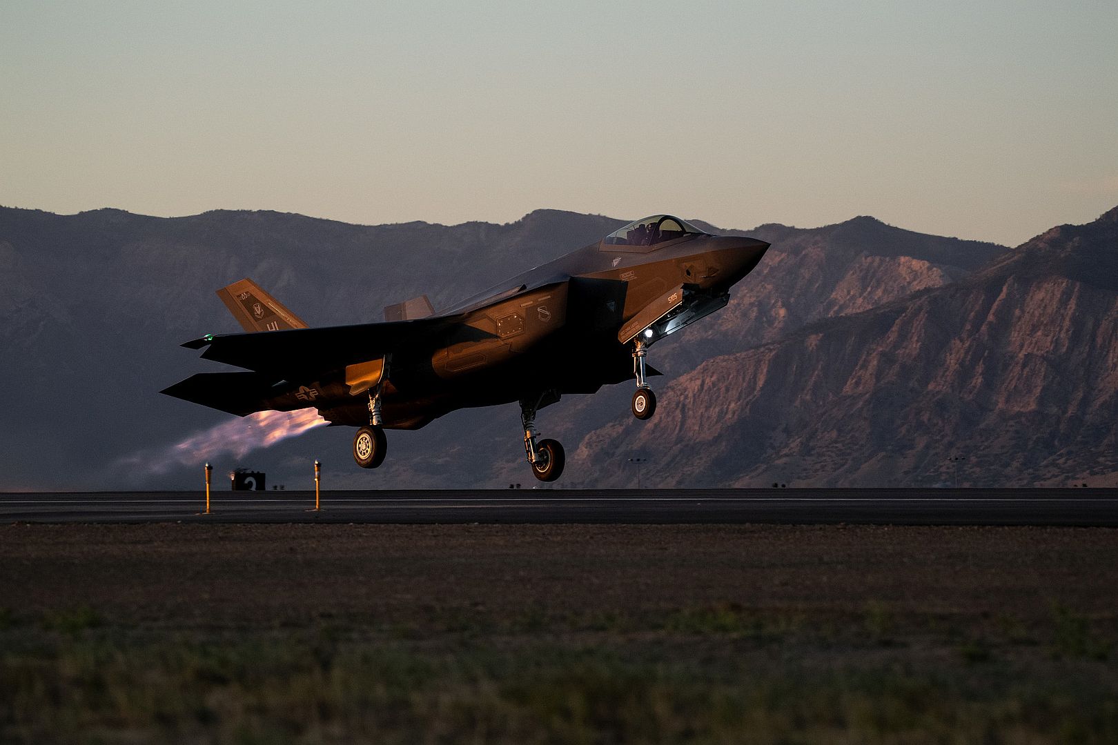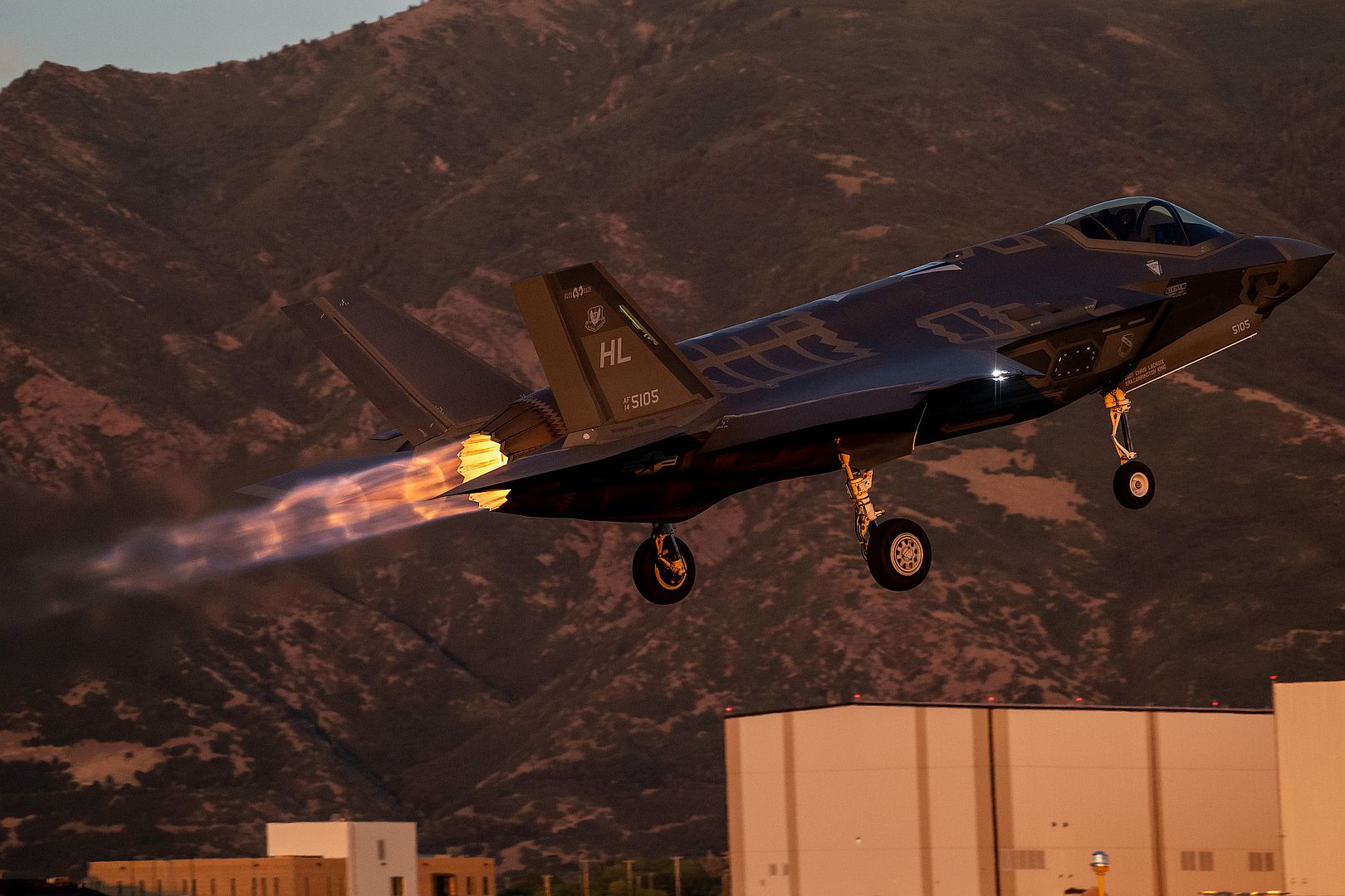An F-35A takes off from Hill Air Force Base, Utah, the evening of Aug. 20, 2019, as the active duty 388th and reserve 419th Fighter Wings conducted local night flying operations. The wings are required to train at night to maintain their readiness and all-weather capabilities. Increased flying also provides a valuable opportunity to evaluate aircraft maintenance resiliency and operational agility. (U.S. Air Force photo by R. Nial Bradshaw)