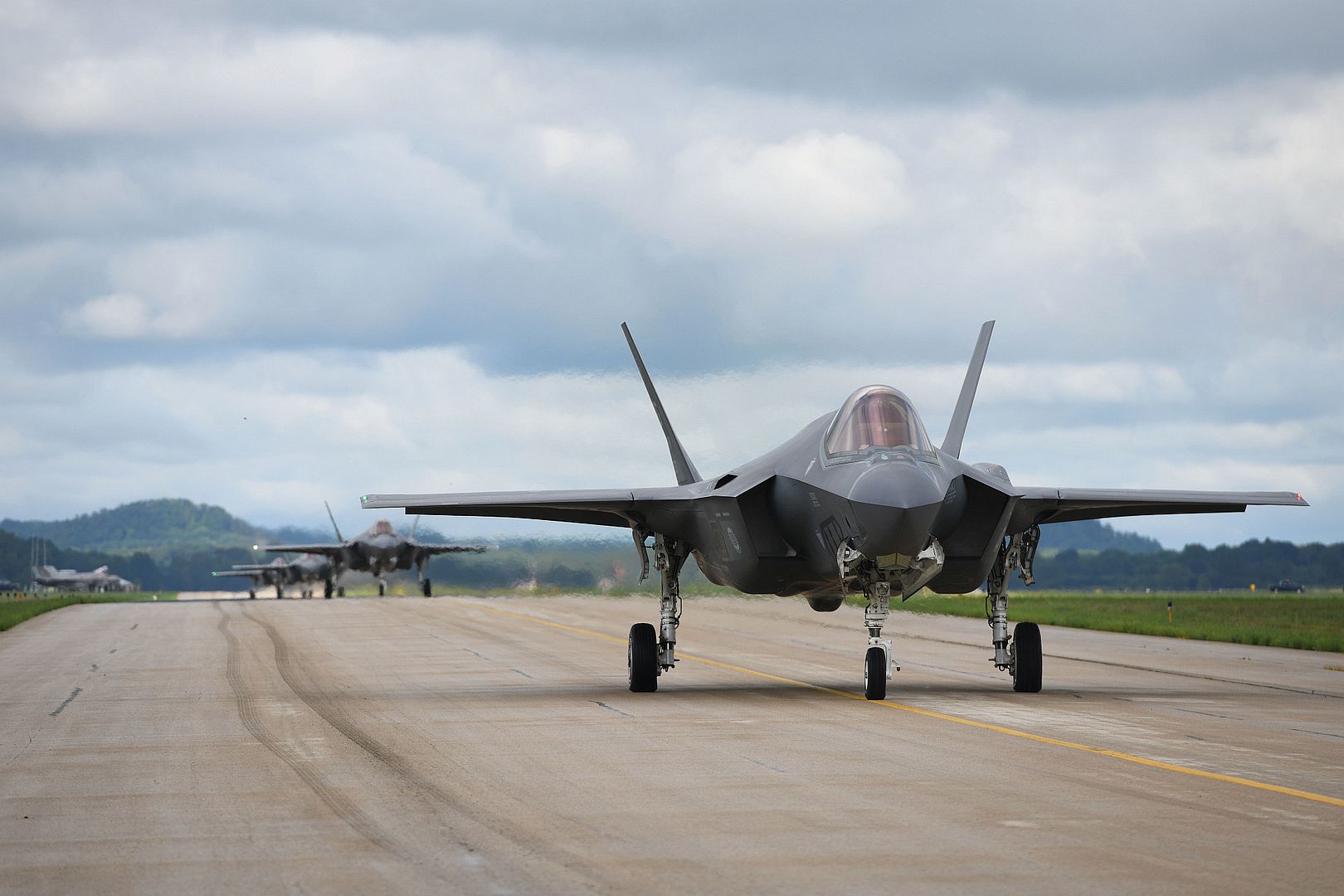 Several 33rd Fighter Wing F-35A Lightning IIs taxi down the Volk Field, Wisconsin. runway, during the Northern Lightning exercise, Aug. 13, 2019. Northern Lightning is a joint total force exercise that provides tactical-level, high-end training for current and future weapons platforms. (U.S. Air Force photo by Airman 1st Class Heather Leveille)