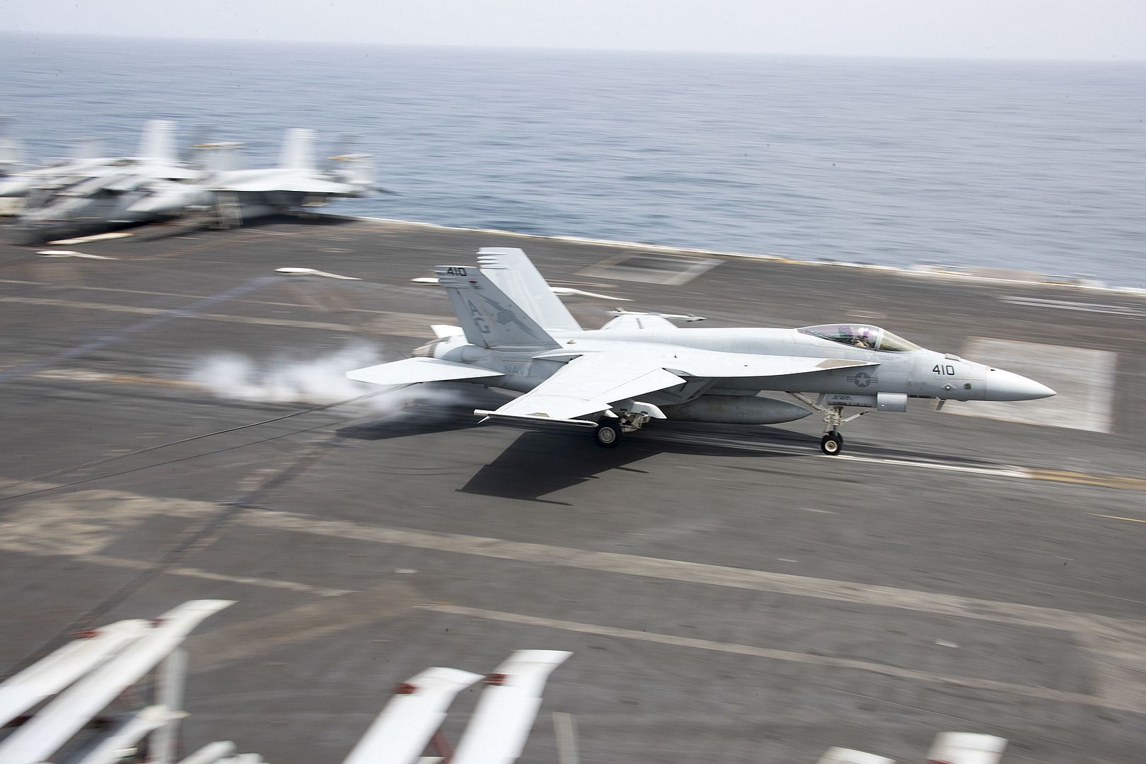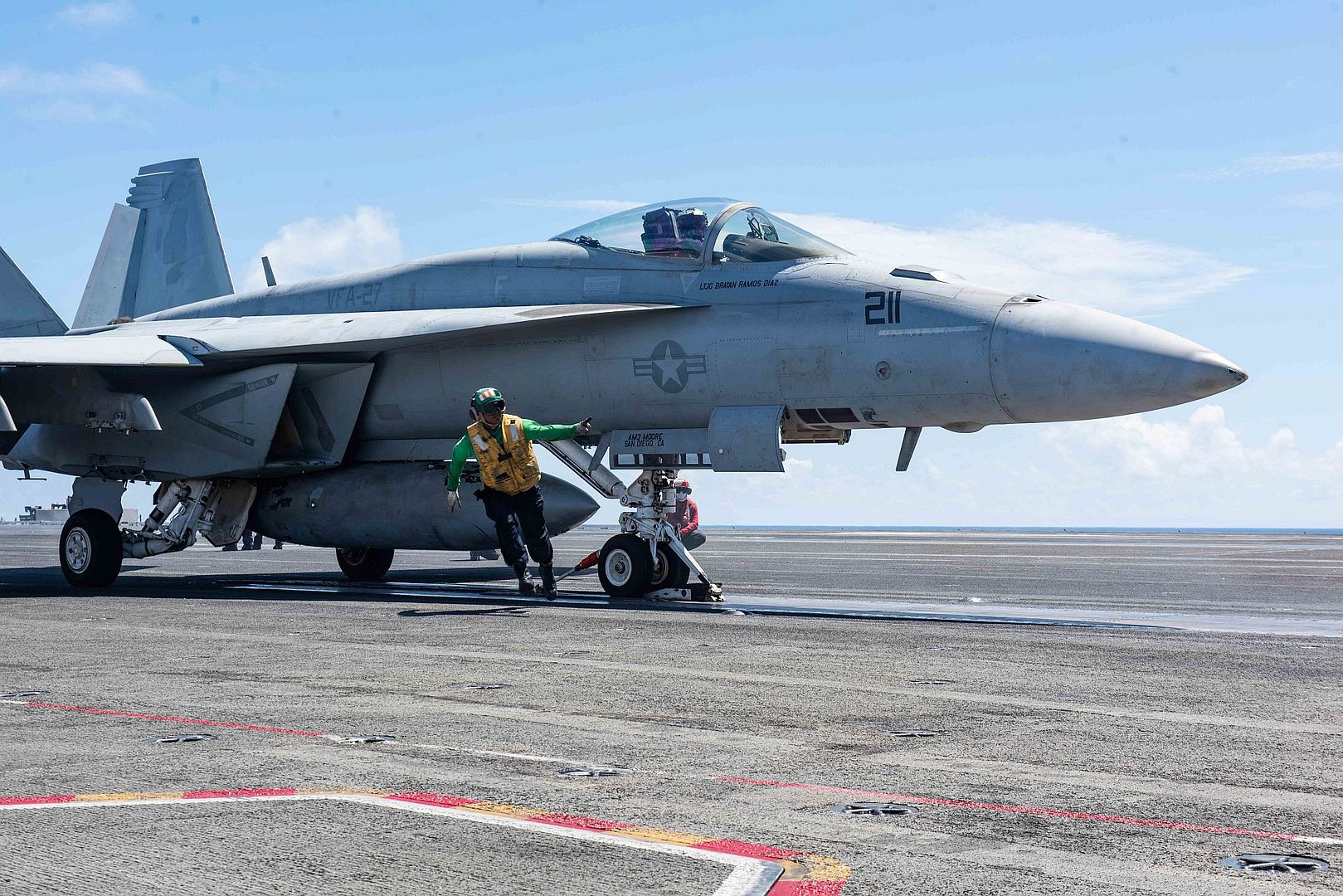 ARABIAN SEA (Aug. 14, 2019) An F/A-18E Super Hornet attached to the "Fist of the Fleet" of Strike Fighter Squadron (VFA) 25 makes an arrested landing on the flight deck of the aircraft carrier USS Abraham Lincoln (CVN 72). Abraham Lincoln Carrier Strike Group is deployed to the U.S. 5th Fleet area of operations in support of naval operations to ensure maritime stability and security in the Central Region, connecting the Mediterranean and the Pacific through the western Indian Ocean and three strategic choke points. With Abraham Lincoln as the flagship, deployed strike group assets include staffs, ships and aircraft of Carrier Strike Group 12 (CSG 12), Destroyer Squadron 2 (DESRON 2), USS Leyte Gulf (CG 55) and Carrier Air Wing 7 (CVW 7). (U.S. Navy photo by Mass Communication Specialist 3rd Class Dan Snow/Released)