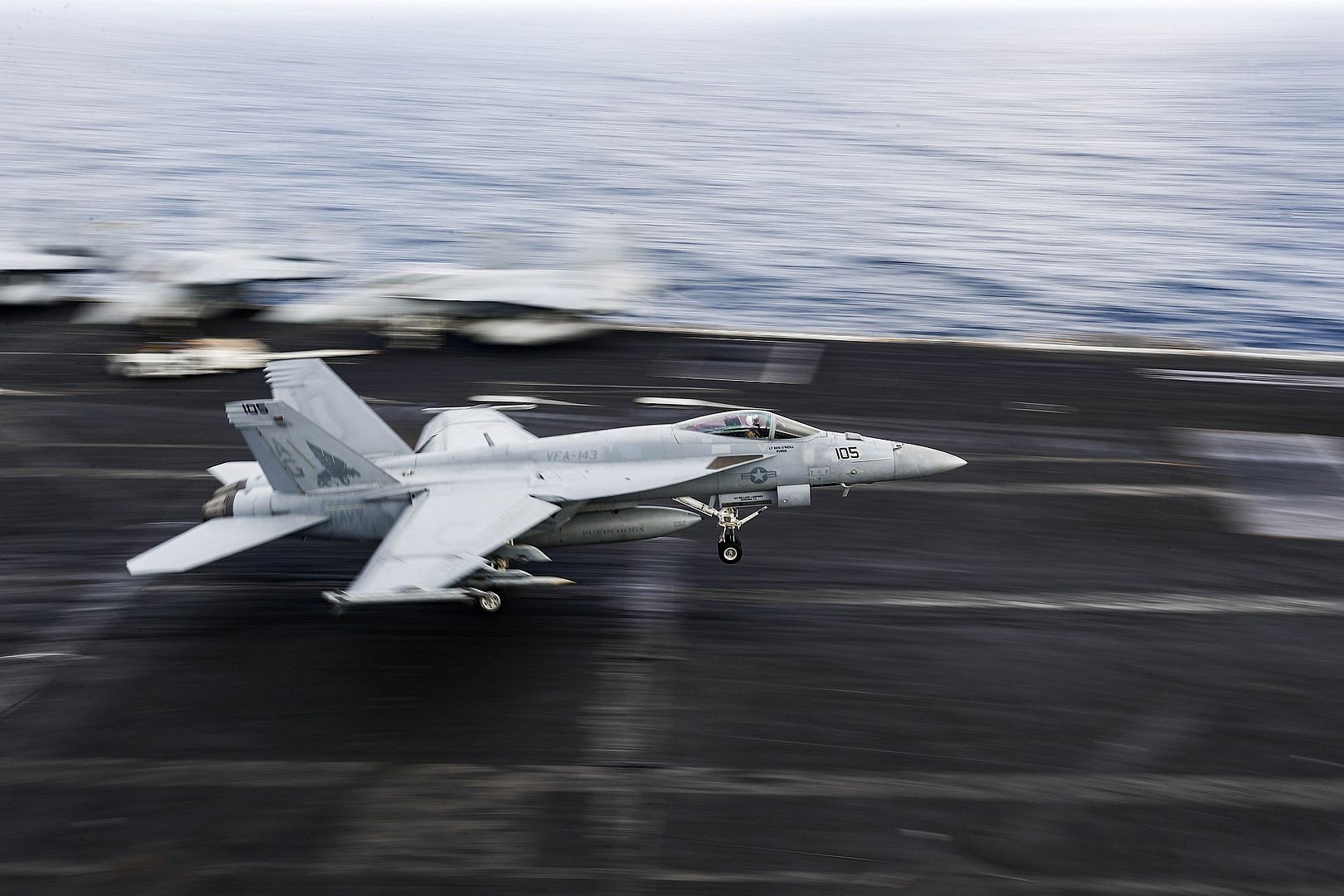 ARABIAN SEA (Aug. 21, 2019) An F/A-18E Super Hornet attached to the Pukin' Dogs of Strike Fighter Squadron (VFA) 143 makes an arrested landing on the flight deck of the aircraft carrier USS Abraham Lincoln (CVN 72). Abraham Lincoln Carrier Strike Group is deployed to the U.S. 5th Fleet area of operations in support of naval operations to ensure maritime stability and security in the Central Region, connecting the Mediterranean and the Pacific through the western Indian Ocean and three strategic choke points. With Abraham Lincoln as the flagship, deployed strike group assets include staffs, ships and aircraft of Carrier Strike Group (CSG) 12 , Destroyer Squadron (DESRON) 2, USS Leyte Gulf (CG 55) and Carrier Air Wing (CVW) 7. (U.S. Navy photo by Mass Communication Specialist 3rd Class Garrett LaBarge/Released)