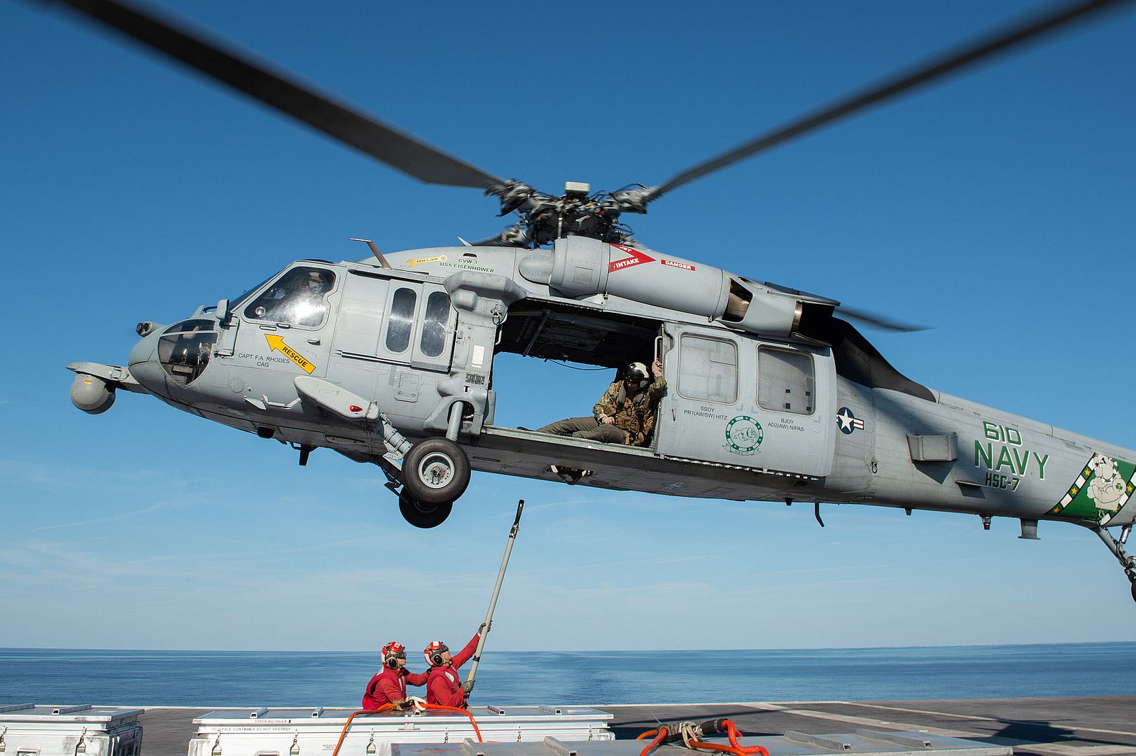 ATLANTIC OCEAN (Aug. 12, 2019) Sailors prepare to hook ammunition onto an MH-60S Sea Hawk helicopter assigned to Helicopter Sea Combat Squadron (HSC) 7 from the flight deck of the aircraft carrier USS John C. Stennis (CVN 74) in the Atlantic Ocean, Aug. 12, 2019. The John C. Stennis is underway conducting routine operations in support of Commander, Naval Air Force Atlantic. (U.S. Navy photo by Mass Communication Specialist 3rd Class Skyler Okerman/Released)