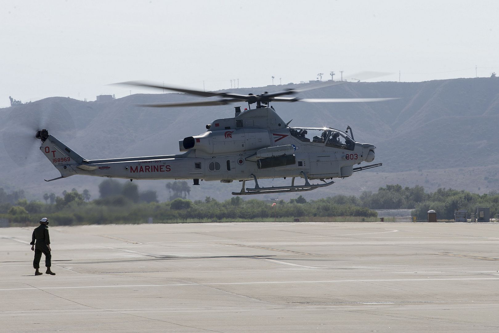 An AH-1Z Viper takes off from the Marine Corps Air Station Camp Pendleton flight line on Marine Corps Base Camp Pendleton, California, Sept. 5, 2019. The air station and the squadrons housed there provide aviation support that enables I Marine Expeditionary Force, Marine Corps Base Camp Pendleton tenant commands and visiting units to maintain and enhance their mission capabilities and combat readiness. (U.S. Marine Corps photo by Lance Cpl. Andrew Cortez)