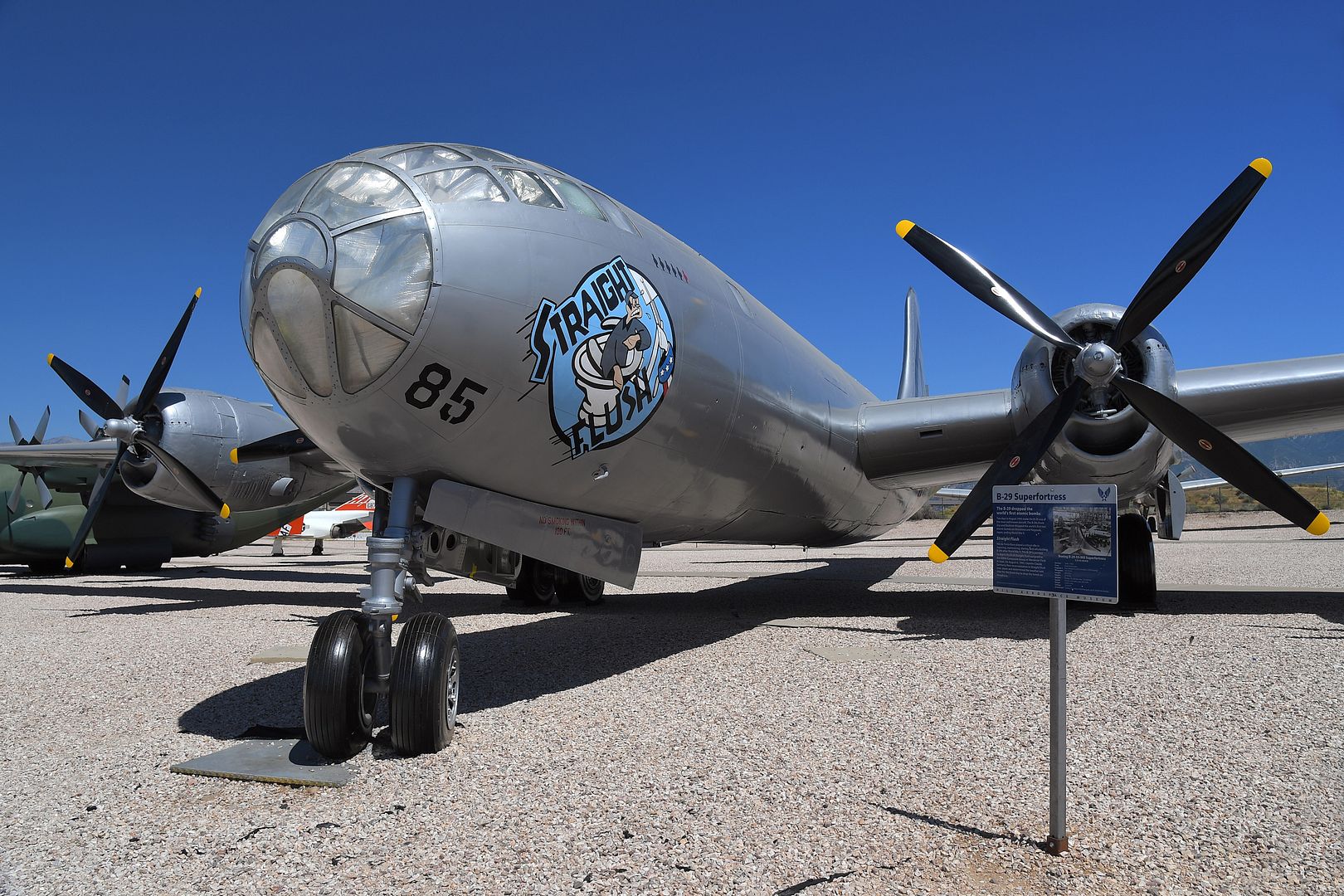 A B-29 Stratofortress on display at the Hill Aerospace Museum Aug. 27, 2019, at Hill Air Force Base, Utah. Museum staff, volunteers and contractors completed a three-year exterior restoration of the aircraft this summer to preserve the airframe, as well as display markings and insignia to accurately represent the famed B-29 nicknamed ?Straight Flush? that trained for top secret operations from Wendover Field during World War II. (U.S Air Force photo by Todd Cromar)