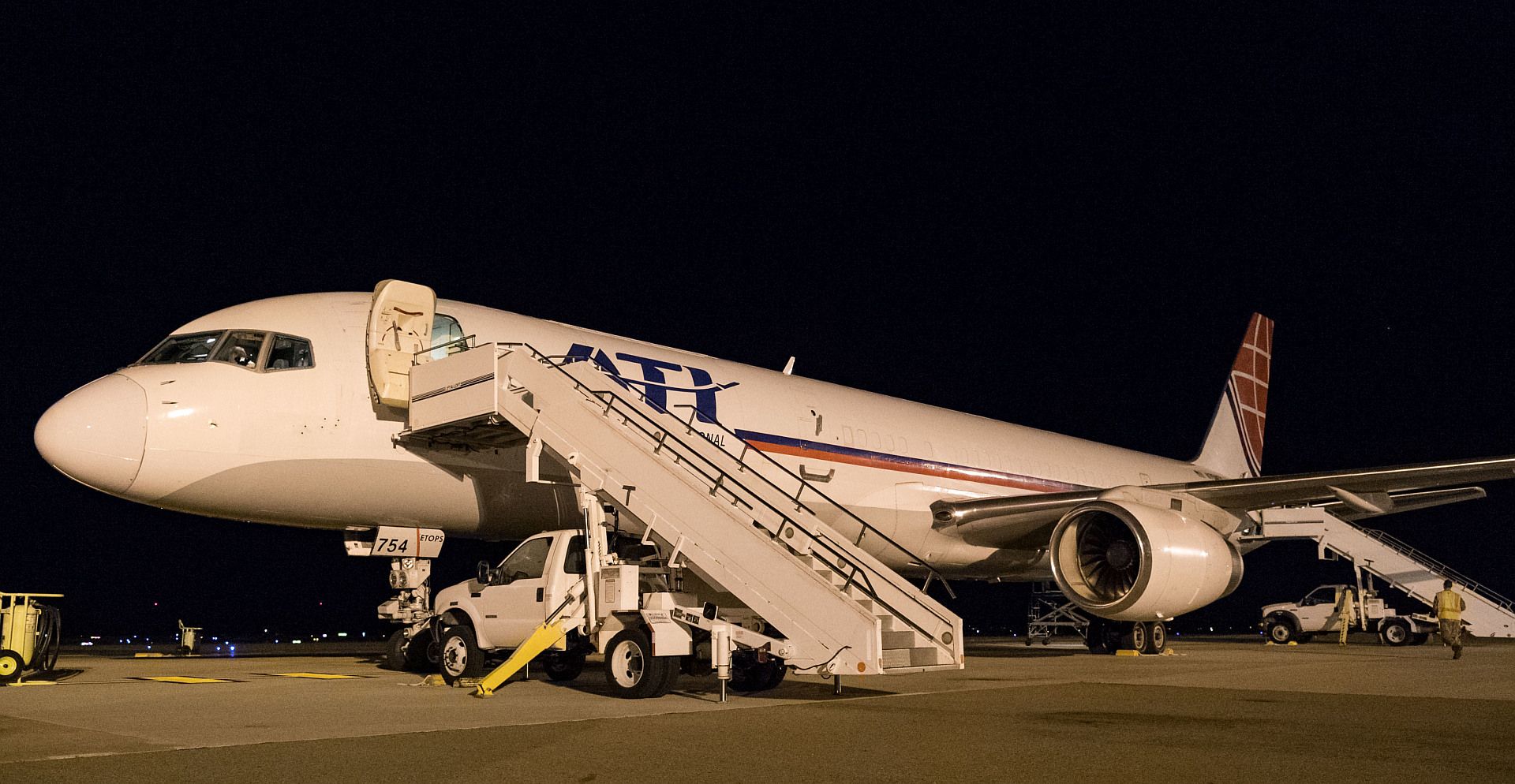 Step trucks sit parked at the forward and aft sections of an Air Transport International Boeing 757-200 Sept. 8, 2019, at Dover Air Force Base, Del. The aircraft, part of the Civil Reserve Air Fleet program, can accommodate up to 10 cargo pallets and has 42 passenger seats. The ATI aircraft was contracted to transport cargo and 30 Team Dover members to Fairchild AFB, Wash., participating in Mobility Guardian 2019. ?Air Mobility Command?s commercial airlift partners are a vital part of our daily airlift missions around the world as well as our wartime effort,? said Maj. Adam Crane, AMC Headquarters CRAF Branch Chief, Scott AFB, Ill. (U.S. Air Force photo by Roland Balik)