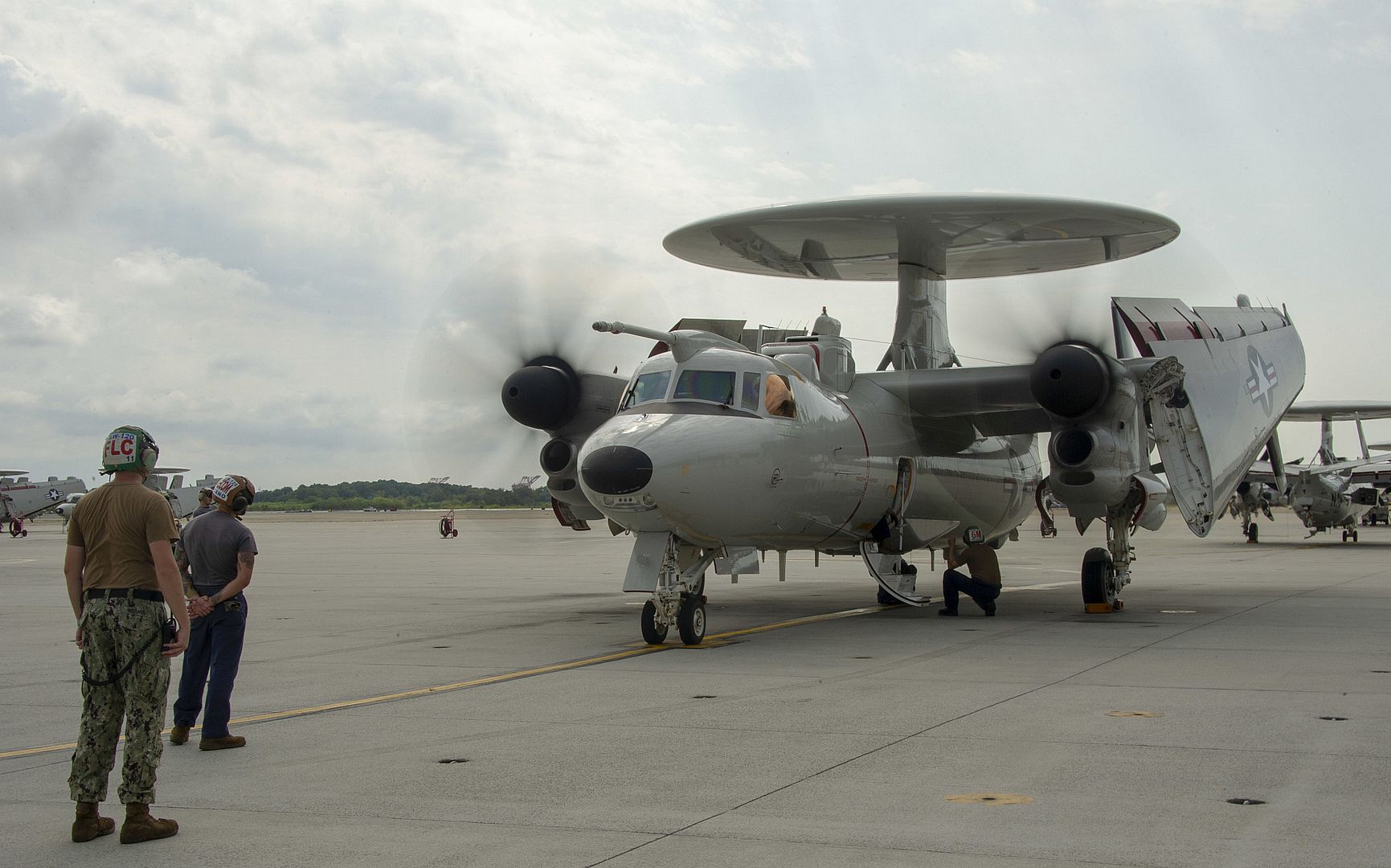 NORFOLK, Va. (September 9, 2019) - An E-2D Hawkeye prepares to land and be recieved by the ?Greyhawks? of Carrier Airborne Early Warning Squadron (VAW) 120 on Monday, September 9 at Naval Station Norfolk. This is the first E-2D Hawkeye with aerial refueling capability to join the fleet, increasing the Navy?s battlespace awareness and integrated fire control ? both from the air and the sea. (U.S. Navy Photo by Mass Communication Specialist 3rd Class Nikita Custer)