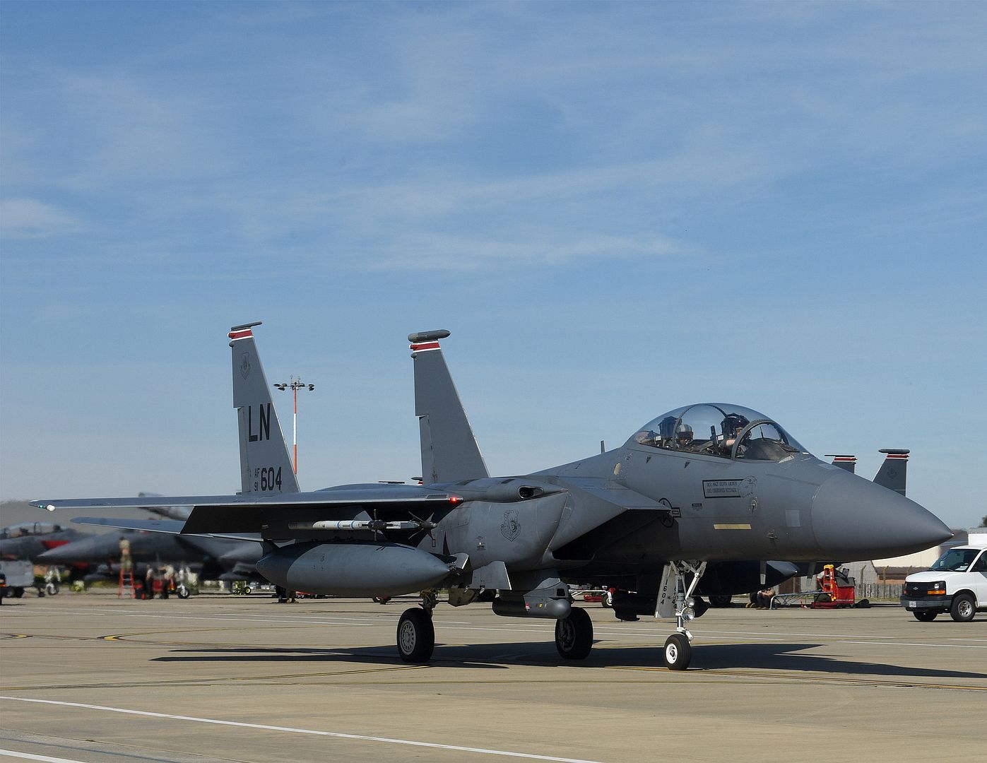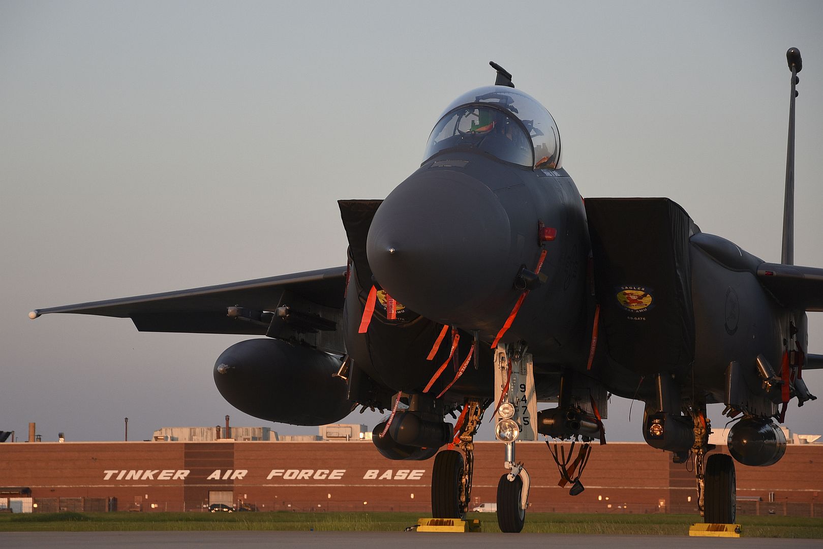 An F-15E Strike Eagle basks in the late evening light after escaping Hurricane Dorian's path and relocating to Tinker Air Force Base, Oklahoma, Sept. 4, 2019. The F-15E is assigned to the 4th Fighter Wing, Seymour-Johnson AFB, North Carolina, as part of Air Combat Command. Team Tinker executed an existing agreement with Seymour-Johnson AFB, North Carolina and Warner-Robins AFB, Georgia to host fighters, tankers and reconnaissance aircraft far away from the devastating hurricane impacting the East Coast of the United States. (U.S. Air Force photo/Greg L. Davis)