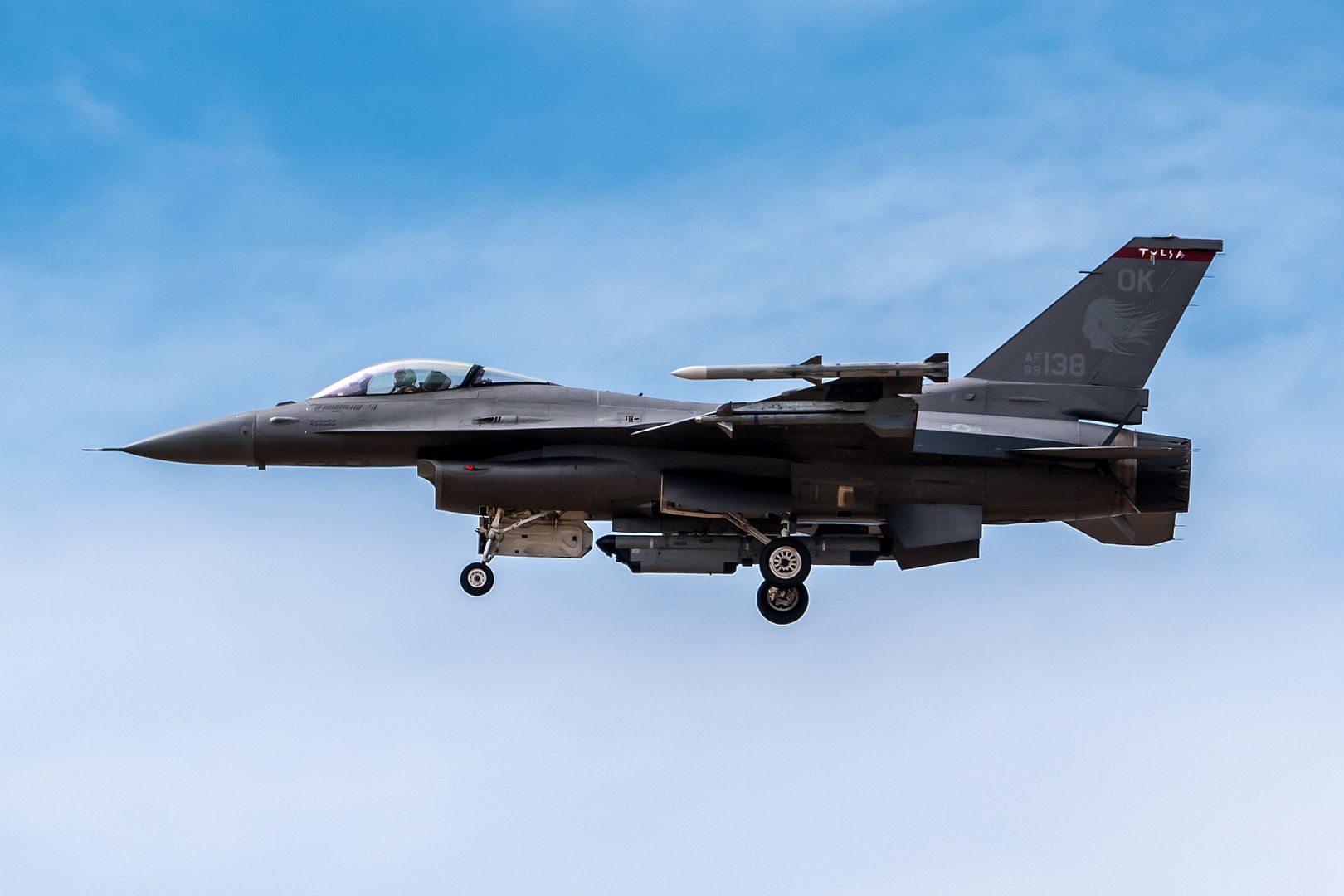 An F-16 Fighting Falcon from the 138th Fighter Wing flies above Joint Base Pearl Harbor-Hickam, Hawaii, Aug. 27, 2019. Combat training flights have been practiced for exercise Sentry Aloha 19-2, which is held on a routine basis to provide Airmen with current, realistic and cost-effective training. This iteration of Sentry Aloha includes Air National Guard members from 15 states and a unit from the Royal Australian Air Force. (U.S. Air National Guard photo by Senior Airman John Linzmeier)