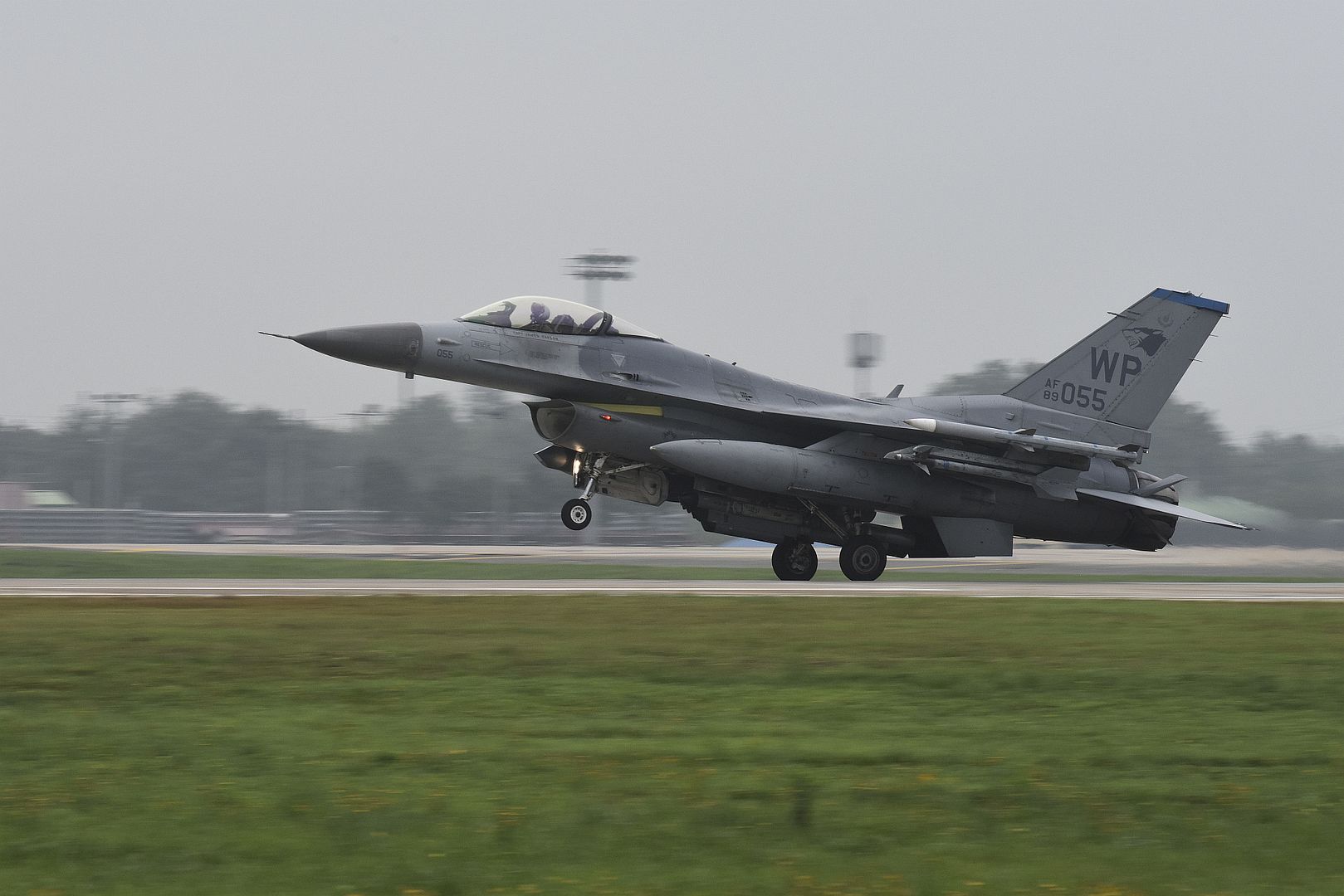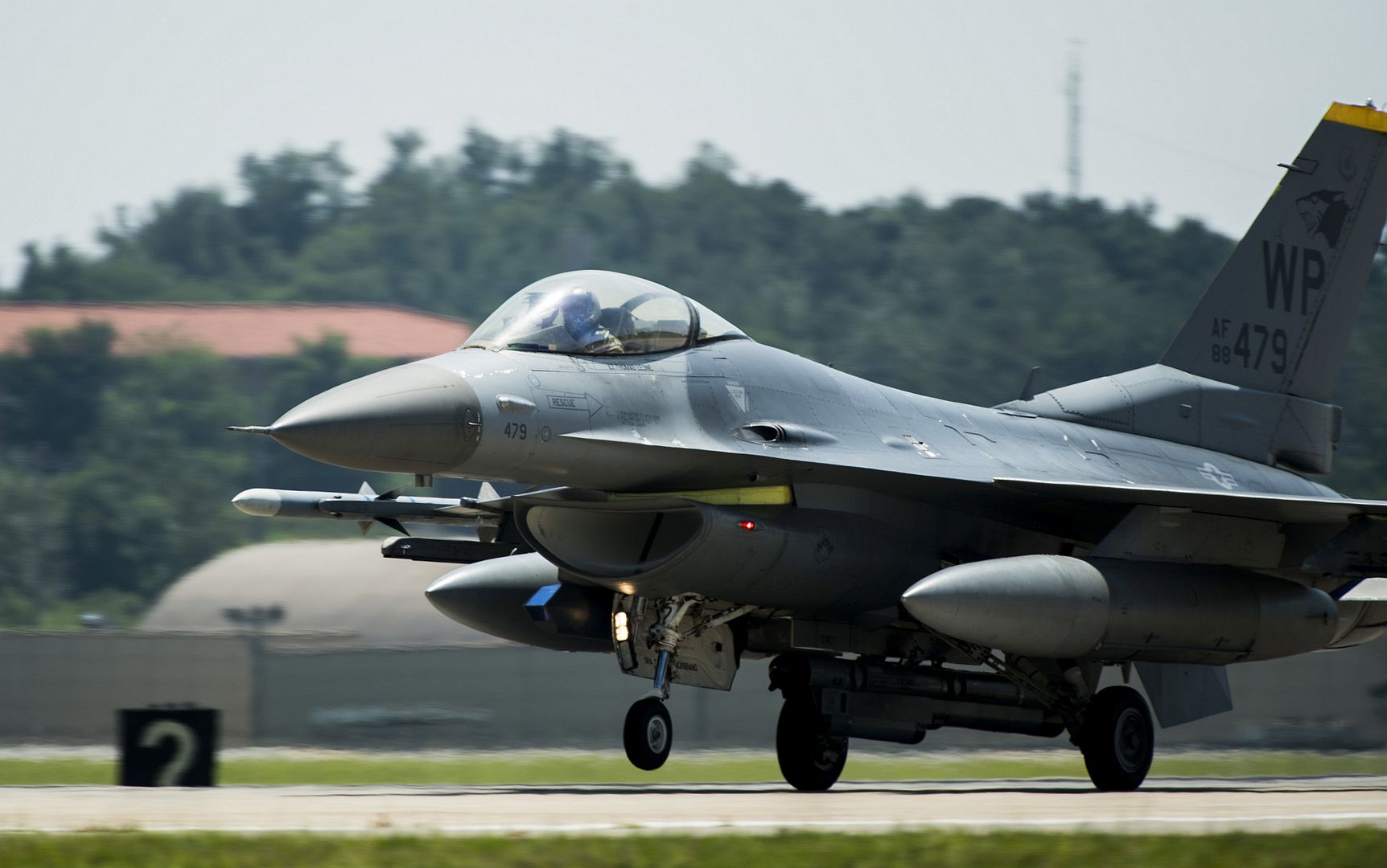 A U.S. Air Force F-16 Fighting Falcon from the 80th Fighter Squadron ?Juvats?, lands following a routine training flight at Kunsan Air Base, Republic of Korea, Aug. 28, 2019. The 8th Fighter Wing is responsible for conducting air-to-ground and air-to-air missions in the 45 F-16s assigned to the wing. Its mission includes air interdiction, close air support, counter air, air superiority and suppression of enemy air defenses. (U.S. Air Force photo by Staff Sgt. Mackenzie Mendez)