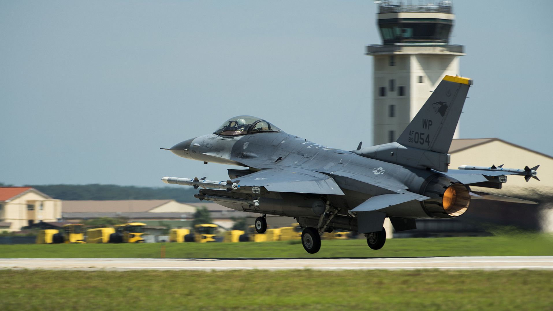 A U.S. Air Force F-16 Fighting Falcon from the 35th Fighter Squadron ?Pantons?, lands following a routine training flight at Kunsan Air Base, Republic of Korea, Aug. 28, 2019. The 35th FS performs air and space control and force application roles including counter air, strategic attack, interdiction, and close-air support missions. It employs a full range of the latest state-of?the-art precision ordnance, day or night, in all weather conditions. (U.S. Air Force photo by Staff Sgt. Mackenzie Mendez)