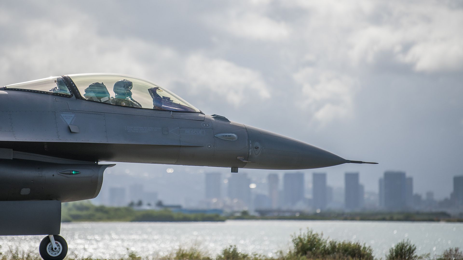 An F-16 Tulsa Viper taxies for flight during a Sentry Aloha exercise Aug. 27, 2019, at Joint Base Pearl Harbor-Hickam, Hawaii. The Hawaii Air National Guard exercise is held several times a year to provide aircraft with dissimilar combat training among participating flying and support units. (U.S. Air National Guard photo by Master Sgt. C.T. Michael)