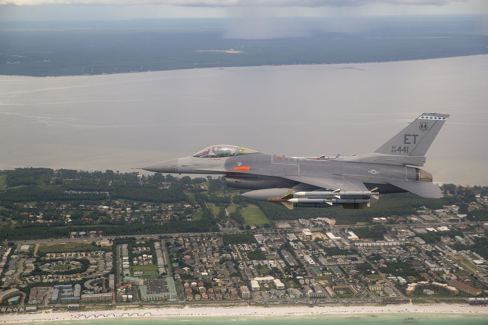 An F-16 from the 40th Flight Test Squadron located at Eglin Air Force Base, Fla., returns to base after completing testing Aug. 23. Flutter testing evaluates the vibration characteristics of the airplane at certain speeds to asses the impact of plane lifetime and safe mission accomplishment. (U.S. Air Force photo by Tech. Sgt. John Raven)