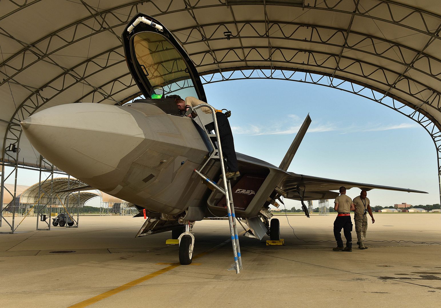 U.S. Air Force Airmen prepare an F-22 Raptor for takeoff at Joint Base Langley-Eustis, Virginia, September 4, 2019. The F-22 was being moved to Rickenbacker Air National Guard Base, Ohio, in preparation for Hurricane Dorian. (U.S. Air Force photo by Airman 1st Class Sarah Dowe)