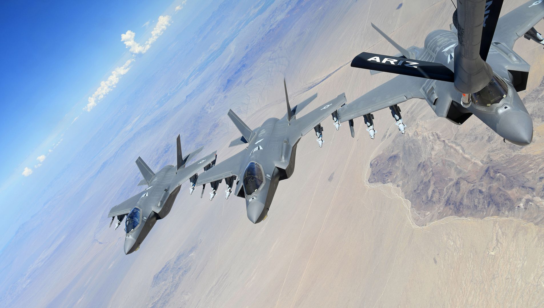 Three F-35A Lighting IIs, assigned to the 63rd Fighter Squadron at Luke Air Force Base, Ariz., fly in formation during a refueling mission Aug. 27, 2019, near Phoenix. A KC-135 Stratotanker, assigned to the Arizona Air National Guard, 161st Fueling Wing, refueled six F-35s. During a refueling mission, the boom operator extends the boom to make contact with the aircraft and once in contact, fuel is pumped through the boom to the aircraft. (U.S. Air Force photo by Airman Brooke Moeder)