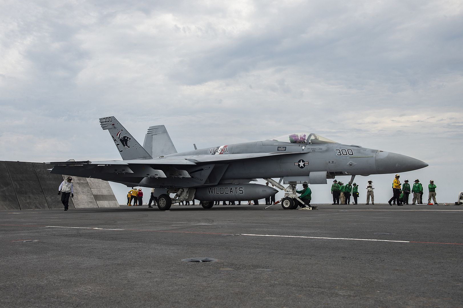 ATLANTIC OCEAN (Sept. 9, 2019) An F/A-18E Super Hornet, assigned to the "Wildcats" of Strike Fighter Squadron (VFA) 131, prepares to take off from the flight deck aboard the aircraft carrier USS Dwight D. Eisenhower (CVN 69). Ike, with embarked Carrier Air Wing 3, is underway conducting the Tailored Ship's Training Availability (TSTA) and Final Evaluation Problem (FEP) as part of the basic phase of the Optimized Fleet Response Plan. (U.S. Navy photo by Mass Communication Specialist Seaman Apprentice Trent P. Hawkins)