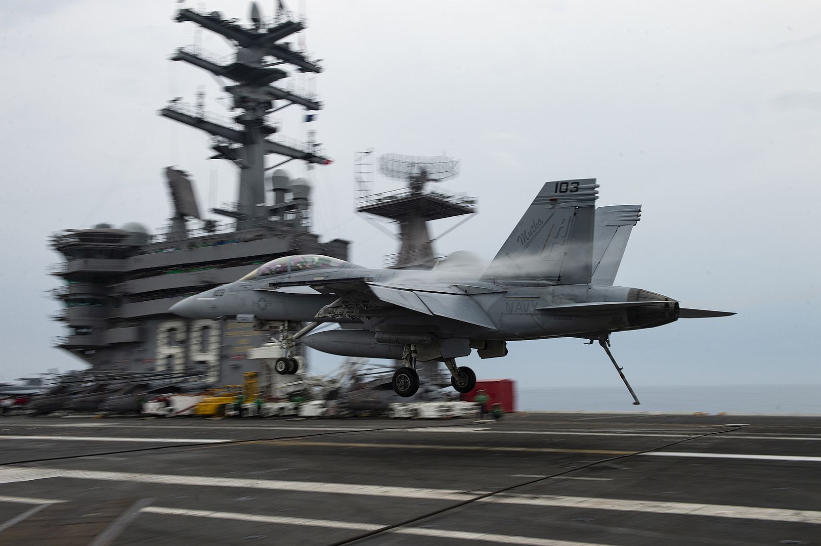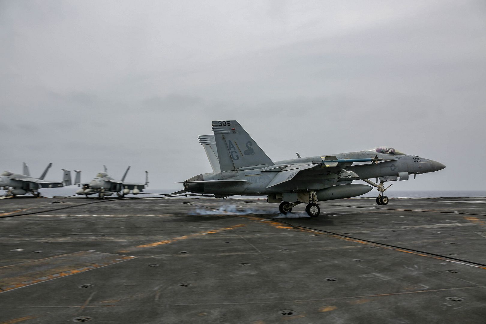ARABIAN SEA (Aug. 29, 2019) An F/A-18E attached to the "Sidewinders" of Strike Fighter Squadron (VFA) 86 makes an arrested landing on the flight deck of the aircraft carrier USS Abraham Lincoln (CVN 72). Abraham Lincoln Carrier Strike Group is deployed to the U.S. 5th Fleet area of operations in support of naval operations to ensure maritime stability and security in the Central Region, connecting the Mediterranean and the Pacific through the western Indian Ocean and three strategic choke points. With Abraham Lincoln as the flagship, deployed strike group assets include staffs, ships and aircraft of Carrier Strike Group 12 (CSG 12), Destroyer Squadron 2 (DESRON 2), USS Leyte Gulf (CG 55) and Carrier Air Wing 7 (CVW 7). (U.S. Navy photo by Mass Communication Specialist 3rd Class Michael Singley/Released)