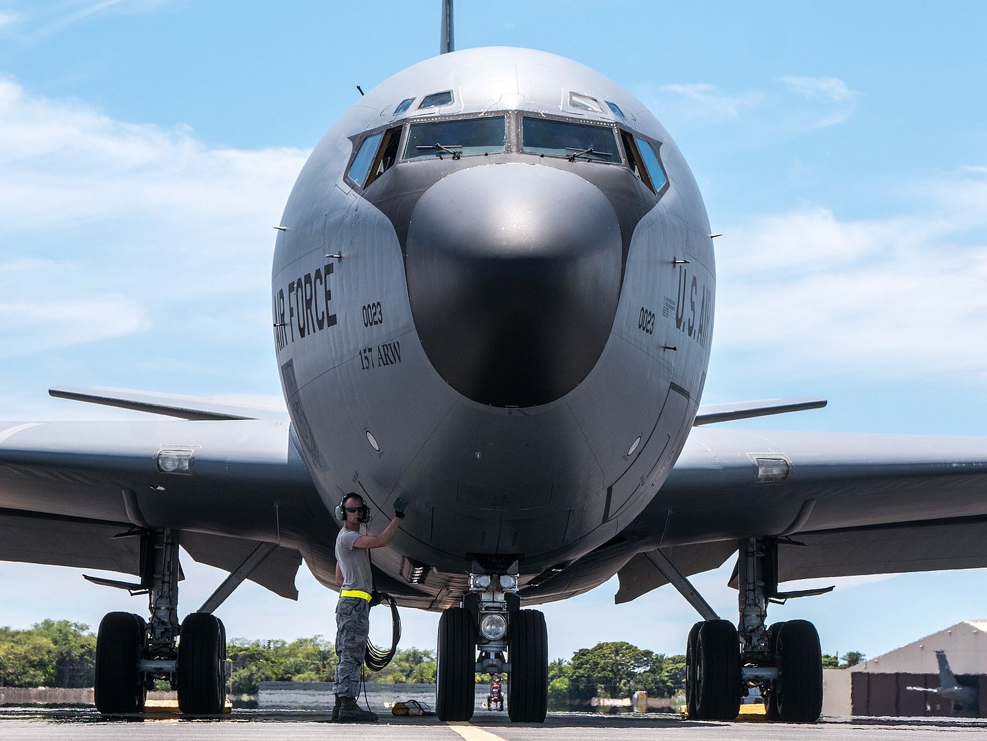Senior Airman Taymon Creger, 151st Aircraft Maintenance Squadron crew chief, prepares a KC-135 Stratotanker for flight Aug. 29, 2019, at Joint Base Pearl Harbor-Hickam, Hawaii. Two Utah Air National Guard Statotankers relocated to Hawaii to participate in exercise Sentry Aloha 19-2 and provide air-refueling support to fighter aircraft. Sentry Aloha provides participants a multi-faceted, joint venue with supporting infrastructure and personnel. (U.S. Air National Guard photo by Senior Airman John Linzmeier)