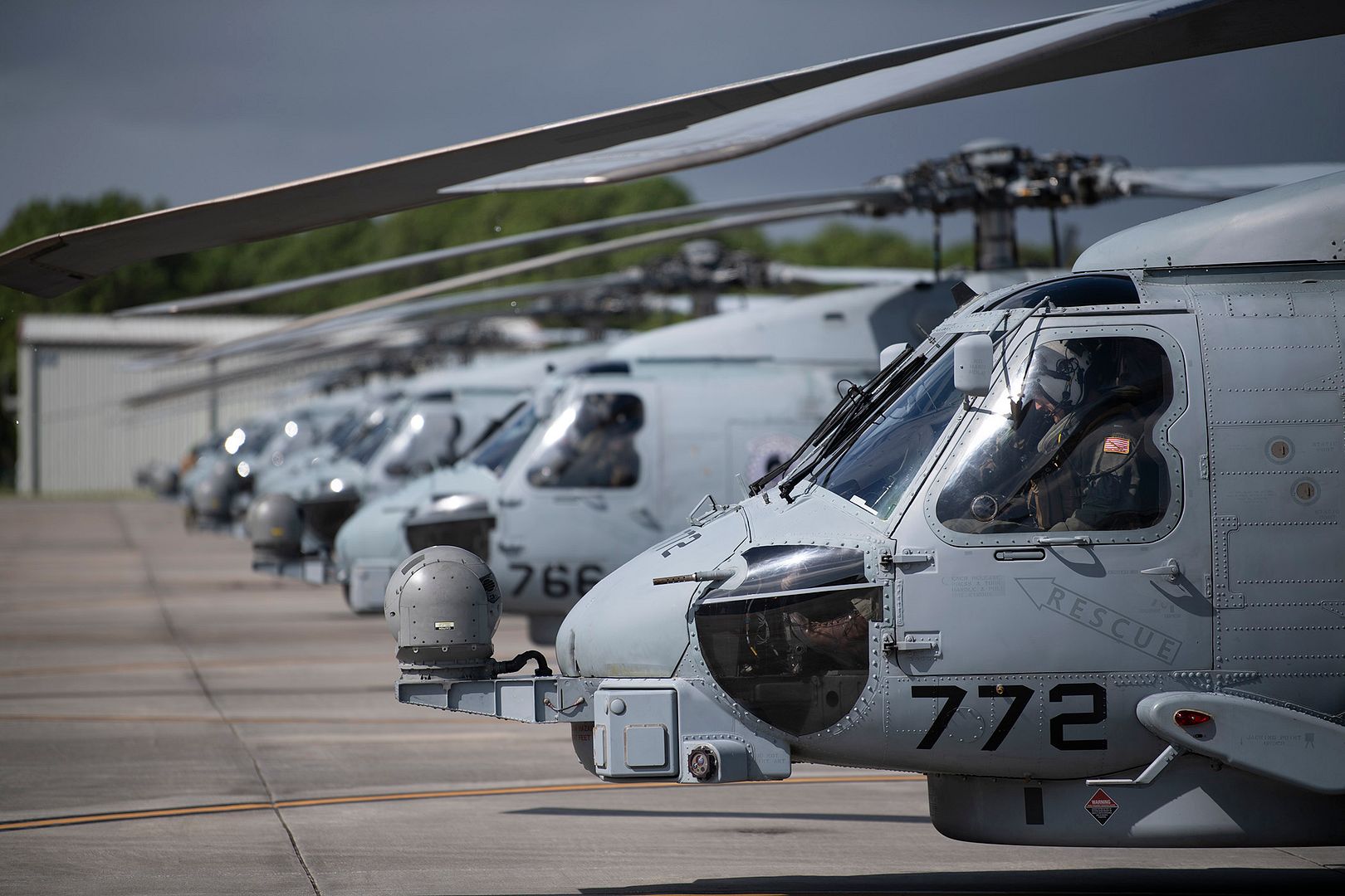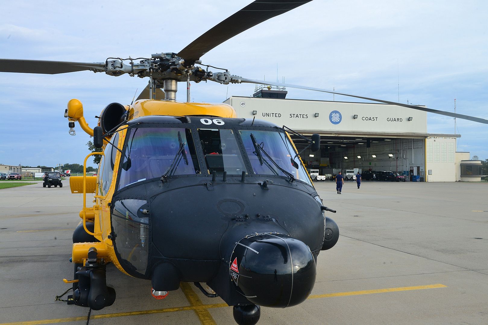 Main AdminA U.S. Coast Guard MH-60 Jayhawk helicopter sits at Air Station Elizabeth City in preparation for Hurricane Dorian Response, Sept. 5, 2019. The aircraft must be thoroughly checked and maintained before enduring the harsh conditions of a hurricane.